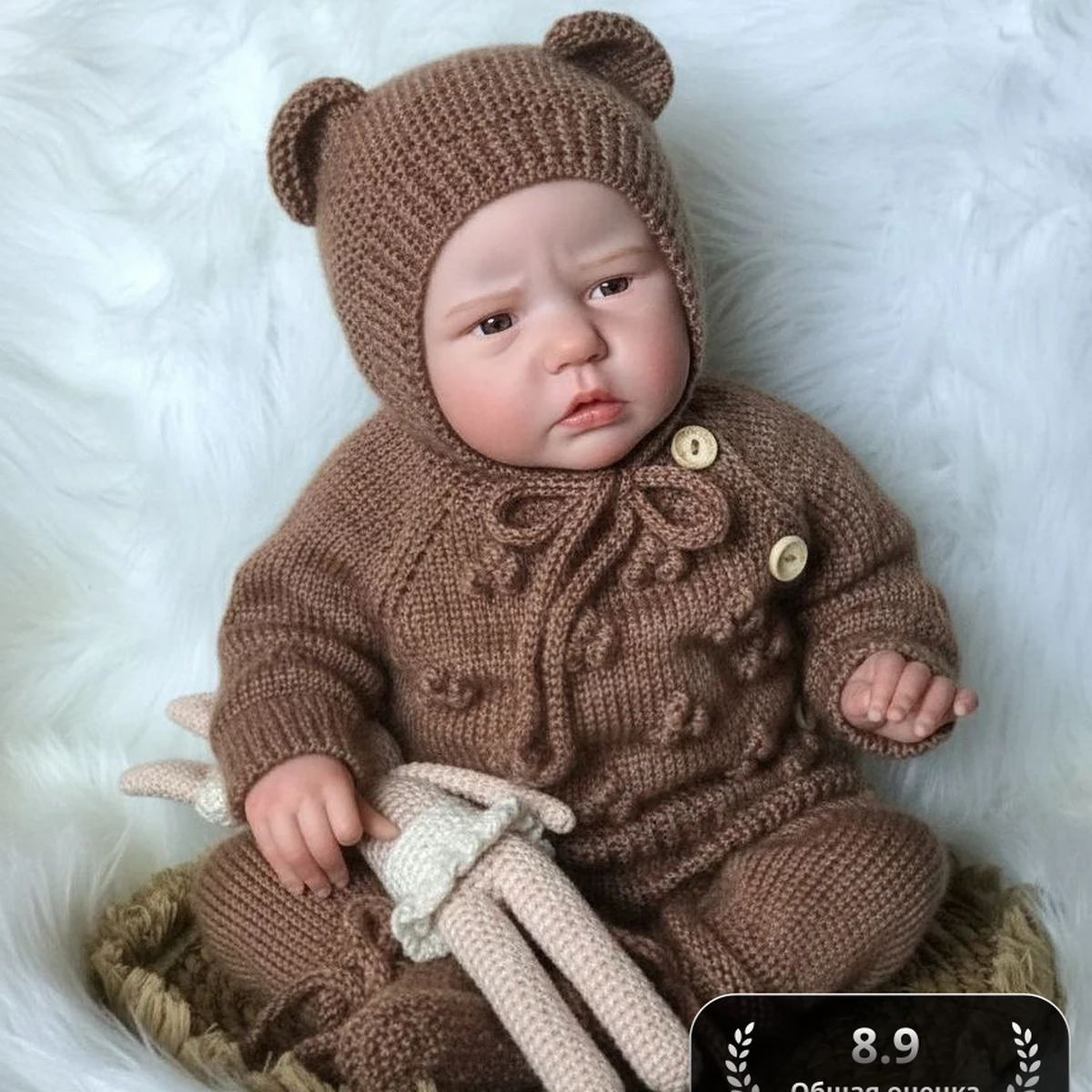 Очень трогательный комплект для малыша: тёплый вязаный костюм в оттенке «какао» и шапочка-шлем с ушками «мишка». Полотно ровное, плотность выдержана, лицевая гладь аккуратная, горловина и планки выглядят чисто обработанными, пуговицы подобраны в тон и не спорят с фактурой. Декор на переде добавляет объёма и «ручного» шарма. В кадре также есть мягкая вязаная куколка/зайка в молочном цвете — приятный компаньон и усиление сказочного настроения. Фото нежное, свет мягкий, изделие отлично читается.