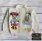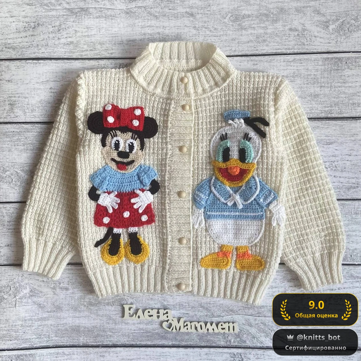На фото — детский вязаный кардиган молочного цвета на пуговицах, с высоким воротником-стойкой и аккуратными манжетами/низом резинкой. Основное полотно выполнено рельефным узором (похоже на «рис/жемчужный»), благодаря чему вещь выглядит фактурно и «дорого». Главный акцент — крупные нашивки-аппликации: Минни в красной юбке в горошек и утёнок в голубом наряде. Аппликации связаны очень ровно, с хорошей читаемостью деталей и аккуратно пришиты — изделие сразу становится нарядным и запоминающимся.