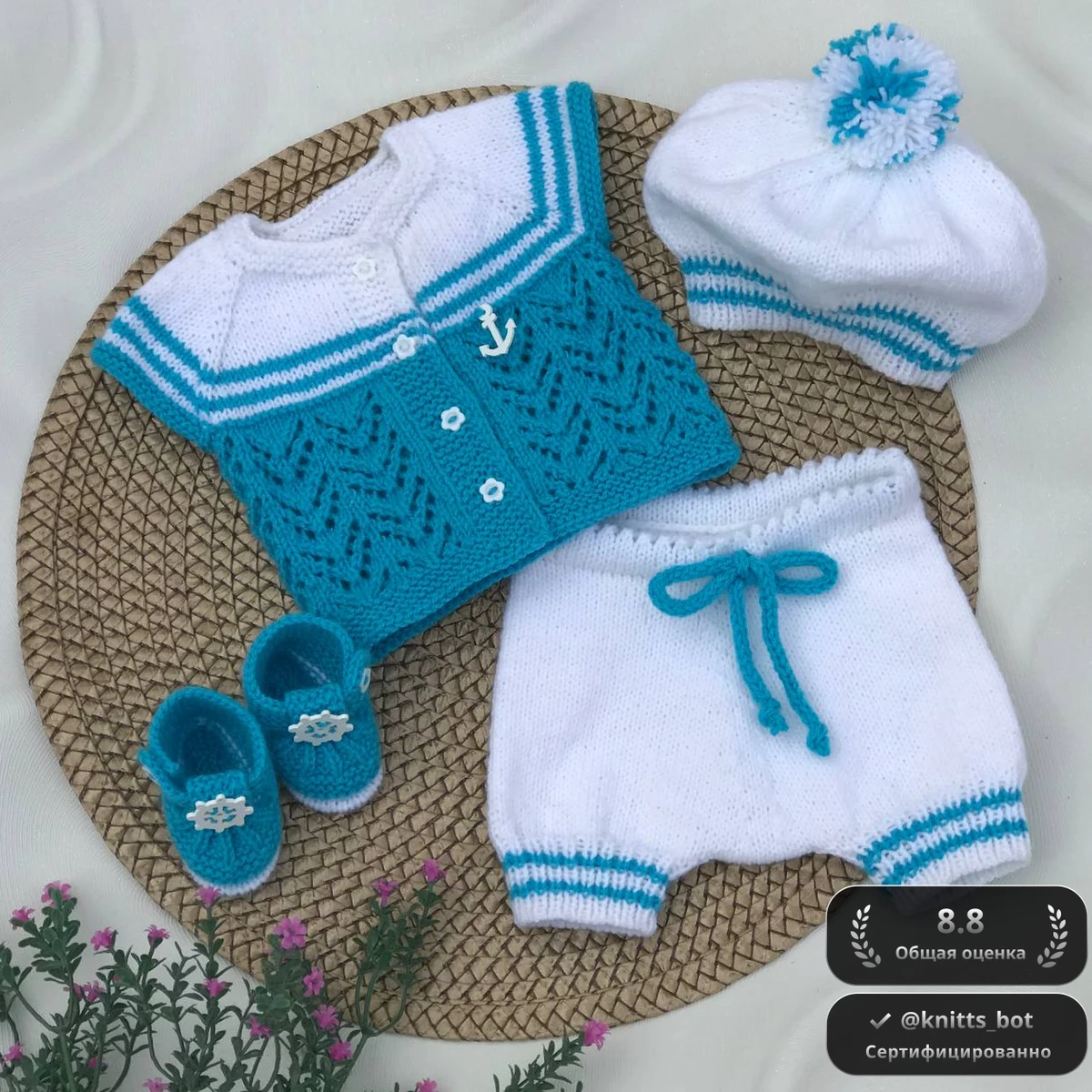 Этот очаровательный набор для новорождённого выполнен в морском стиле и включает в себя четыре предмета: жилетку, береты, шортики и пинетки. Жилетка и шортики украшены узором, напоминающим морские волны, и дополнены маленьким якорьком, придающим особую морскую атмосферу. Шапочка и пинетки сохраняют гармонию за счёт единой цветовой гаммы: белый и бирюзовый, что напоминает о прохладном морском бризе и чистых облаках. Такой комплект будет кстати для летней прогулки, особенно вблизи водоемов.
