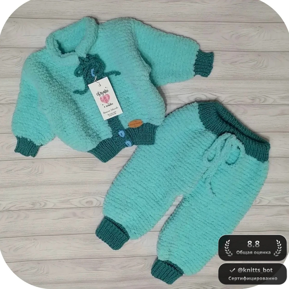 Очаровательный комплект для малыша – уютная плюшевая курточка-бомбер и свободные штанишки-джоггеры в нежном мятном цвете с контрастными тёмно-бирюзовыми резинками. Объёмная фактура пряжи «травка» создаёт облачко-мягкость, а плотные эластичные манжеты надёжно держат тепло и не дают продуваться. Курточка дополнена декоративным шнурком-бантиком, аккуратной планкой на пуговицах и фирменной кожаной нашивкой, что придает изделию авторский штрих. Штанишки имеют комфортный пояс со шнурком на утяжку и слегка зауженные к низу штанины – малышу будет удобно ползать и делать первые шаги. Аккуратная, ровная плотность полотна демонстрирует уверенное владение техникой.