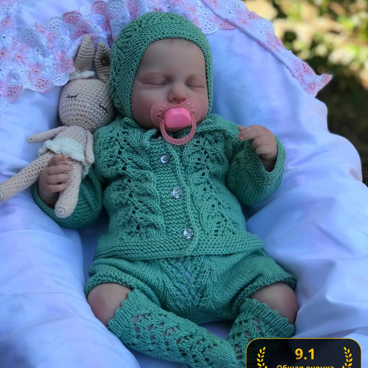 Перед вами очаровательный комплект для новорождённого — зелёный вязаный набор из кофточки, шапочки, шортиков и носочков, украшенный сложным ажурным узором. Рядом уютно устроилась вязаная крючком игрушка-зайка в светлых тонах, которая отлично дополняет композицию. Всё исполнено с высоким мастерством: детали набора продуманы до мелочей, пряжа выбрана аккуратно, а ажурная вязка придаёт комплекту воздушность и изысканность. Композиция уютная, а цветовая палитра успокаивающая и гармоничная, чудесно подходящая для малышей.