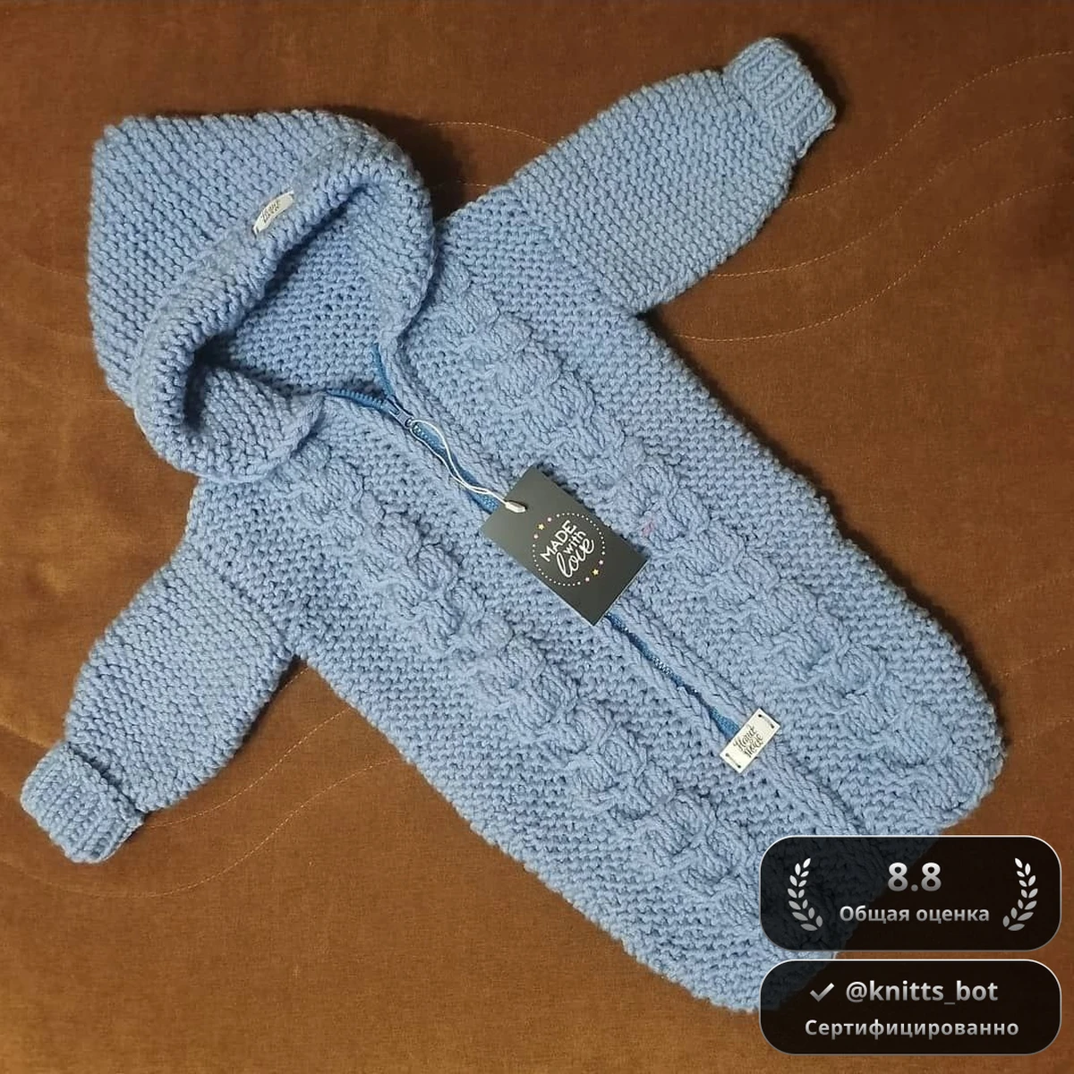 Очаровательный детский конверт-комбинезон в небесно-голубом цвете связан плотной платочной вязкой, которая создает уютную пружинистую текстуру и прекрасно сохраняет тепло. В центре проходит выразительная полоса из объёмных «клетчатых» кос, придающих модели рельеф и интересный визуальный акцент. Капюшон плавно переходит из полотна и аккуратно окантован, создавая мягкую «рамку» вокруг личика малыша. Рукава закончены эластичными манжетами-отворотами, которые легко подгибаются под рост ребёнка. Вшитая молния в тон делает изделие практичным и обеспечивает лёгкое одевание даже спящего младенца. В целом вещь выглядит очень аккуратно, профессионально и определённо «сделана с любовью»!