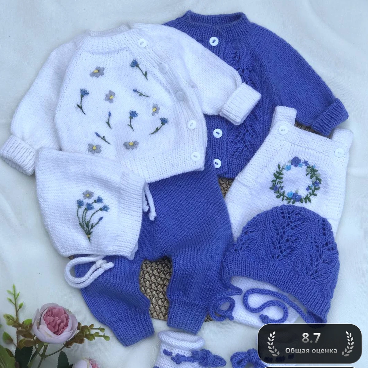 Очаровательный комплект для малыша, выполненный в нежном дуэте молочного и василькового оттенков. В кадре – лёгкий реглан-кардиган top-down с вышитыми полевыми цветами, ажурный васильковый кардиган с мотивом «листья», комфортные штанишки на резинке, сарафан-полукомбинезон с вышитым веночком, кружевная шапочка-чепчик на завязках и миниатюрные пинетки с шнуровкой. Мягкая пряжа из мериноса дарит изделиям пушистую, но ровную фактуру, а аккуратная ручная вышивка гладью подчёркивает природную тему. Ажурный узор раскрывается особенно живописно в васильковом цвете, создавая ощущение лёгкости. Все детали гармонично сочетаются, образуя единый, уютный ансамбль для самых маленьких.