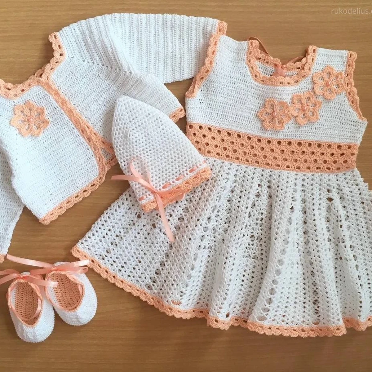 Нежнейший комплект для малышки в бело‑персиковой гамме: ажурное платьице с кокеткой, кофта с аккуратной обвязкой «пико», длинный шарфик, шапочка и пинетки с атласными лентами. Очень приятная «русская школа» крючка — ровные ряды, чистые прибавки/убавки, достойная посадка кокетки и красиво раскрывающийся ажур юбки. Аппликации‑цветочки добавляют нарядности, а единая кайма объединяет все вещи в один образ.