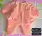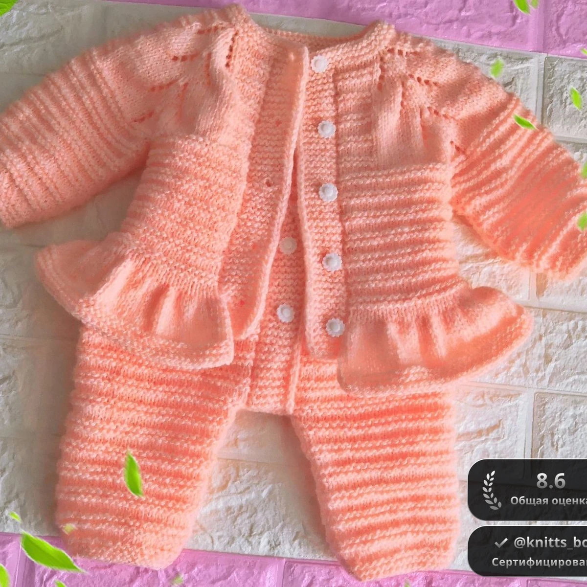 На фото — нежный вязаный детский комбинезончик персикового оттенка с застёжкой на белые пуговицы. Полотно выглядит выполненным преимущественно платочной вязкой: аккуратные горизонтальные «рубчики» дают мягкую, пластичную фактуру. Очень милые детали — два накладных кармашка и небольшая оборка/баска по линии талии, а также ровные манжеты и аккуратно оформленная планка. Изделие выглядит тёплым, уютным и явно сделано с любовью — отличный вариант для малышей и как подарок.