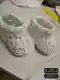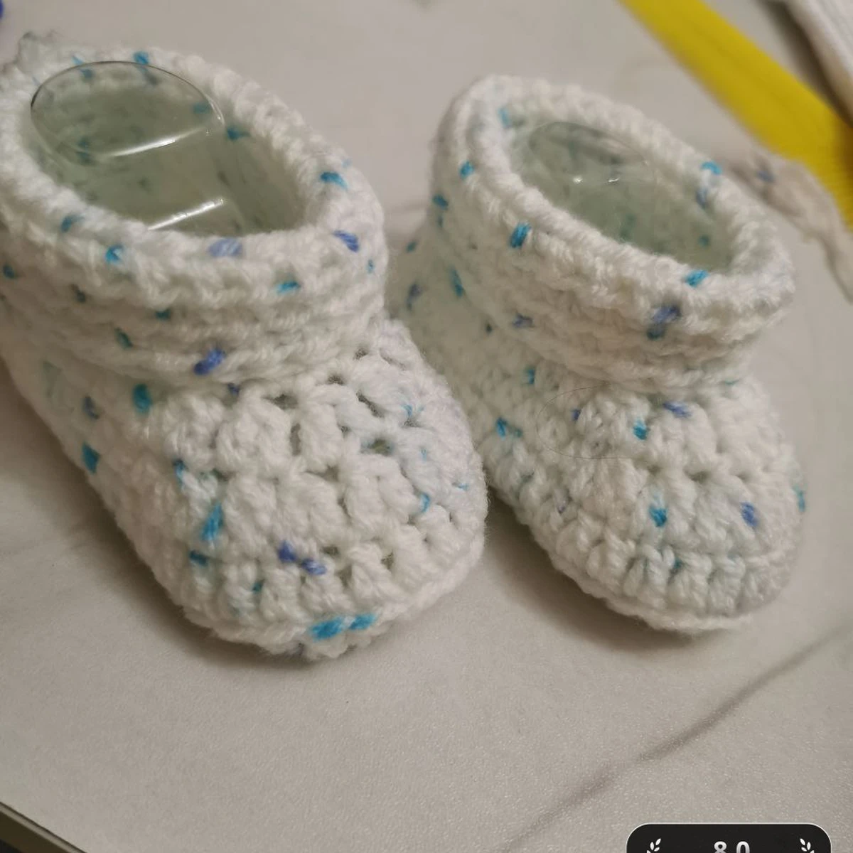 На фотографии изображены вязаные детские пинетки, которые выглядят невероятно уютно и мило. Они выполнены из белой пряжи с вкраплениями голубых и бирюзовых точек, что добавляет им игривости и интереса. Эти пинетки, безусловно, станут прекрасным дополнением к гардеробу малыша благодаря своей мягкости и теплоте.