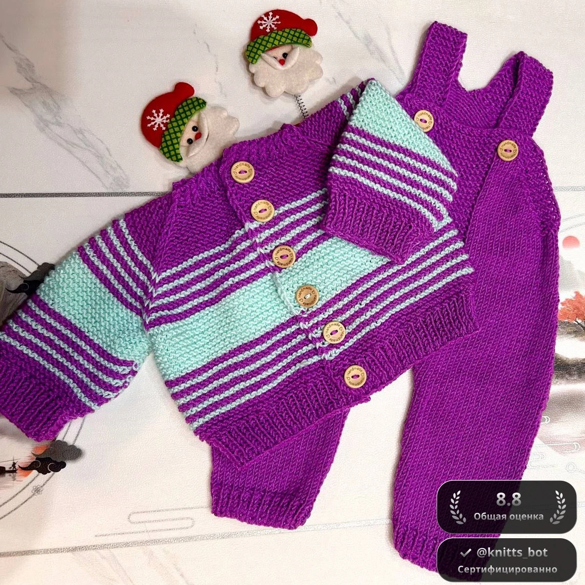 Этот вязаный комплект для малышей, состоящий из милого свитерка и штанишек в ярких пурпурных и бирюзовых полосках, исполнен с высоким мастерством. Аккуратно связанные пуговицы добавляют очарования и функциональности, а использование двухцветной схемы создает свежий и стильный образ. Подходит для прохладных дней, и каждый ребенок будет выглядеть в нем просто замечательно.