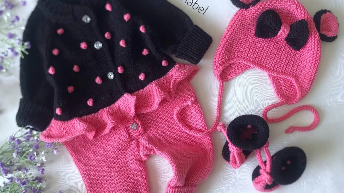 Основная часть комплекта выполнена на спицах, с упором на чистую детскую отделку. Полотно комбинезона связано лицевой гладью с плотной, ровной структурой; манжеты и, вероятно, нижние края — резинкой 1×1/2×2 для хорошей посадки и удержания формы. Переходы между чёрным и розовым цветом сделаны аккуратно, без явных «ступенек», что важно для контрастных сочетаний. Фактурный декор на чёрной части выполнен в виде вывязанных «шишечек/пупырышек» (элементы, формируемые из одной петли или короткими прибавками с последующим провязыванием вместе), что даёт объёмные точки. Оборка по линии талии/кокетки сделана отдельной полосой с прибавками, создающими волну; при правильной ВТО она раскрывается и ложится мягкими фалдами. Шапочка связана платочной вязкой (поперечные рубчики хорошо видны), с убавками к макушке и завязками‑шнурками (возможен полый шнур i-cord или скрученный шнур). Ушки выполнены отдельно, затем пришиты по контуру. Контрастные вставки формируют «пандий» образ. Пинетки и рукавички выдержаны в той же гамме: плотная вязка, вероятно, с формированием мыска и пятки укороченными рядами/убавками, плюс декоративные завязки для фиксации. Финишная сборка включает пришивные пуговицы и аккуратные соединительные швы; финальная ВТО (лёгкое отпаривание через проутюжильник) помогает выровнять лицевую гладь и раскрыть оборку.