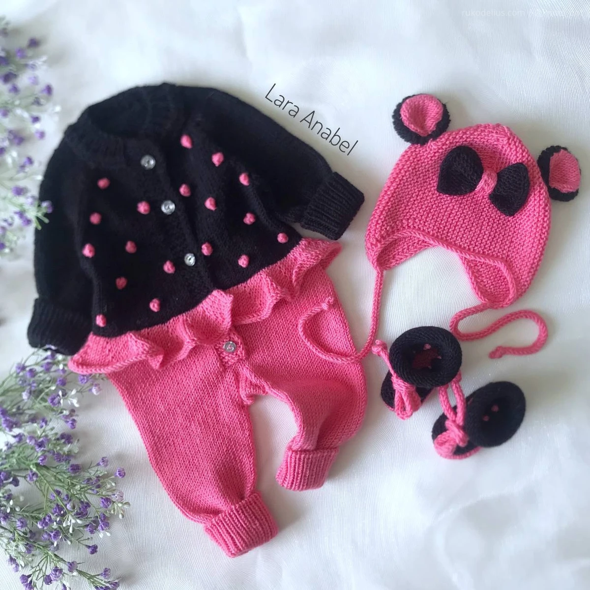 Очаровательный детский комплект в контрастной чёрно‑розовой гамме: комбинезон с кокеткой и декоративными «шишечками», игривая оборка по талии, шапочка с ушками «пандочки», а также пинетки и рукавички в тон. Вязка выглядит аккуратно и ровно, резинки хорошо держат форму, а мелкий декор добавляет фактуру и делает вещь «праздничной». Стилистика цельная: повтор цветов и деталей связывает весь набор в один продуманный образ.