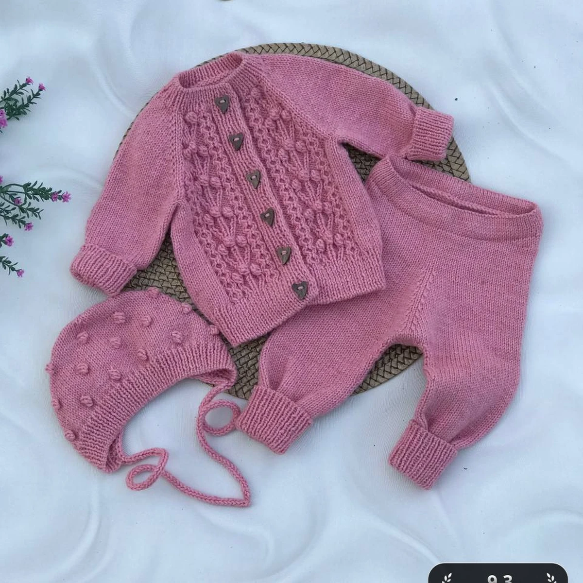 На фото представлен великолепный вязаный комплект для малыша, состоящий из уютного кардигана, милых штанишек и очаровательной шапочки с шишечками. Каждый элемент выполнен в единой цветовой гамме, что придаёт изделию цельность и гармонию. Особенно выделяется фантазийный узор на кардигане, который придаёт ему уникальность и индивидуальность.