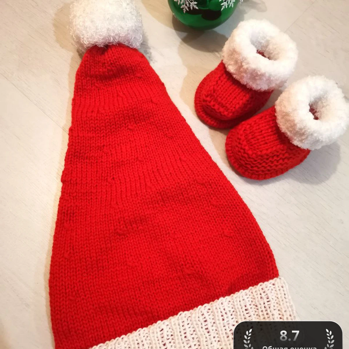 Очаровательный комплект в стиле Санта-Клауса включает в себя длинный красный колпак с белой помпоном на конце и пара уютных пинеток. Колпак связан в ярком праздничном стиле, в сочетании с белыми пинетками, они обеспечивают атмосферу тепла и уюта. Белый манжет пинеток, как и белая кайма колпака, добавляют игривый акцент.