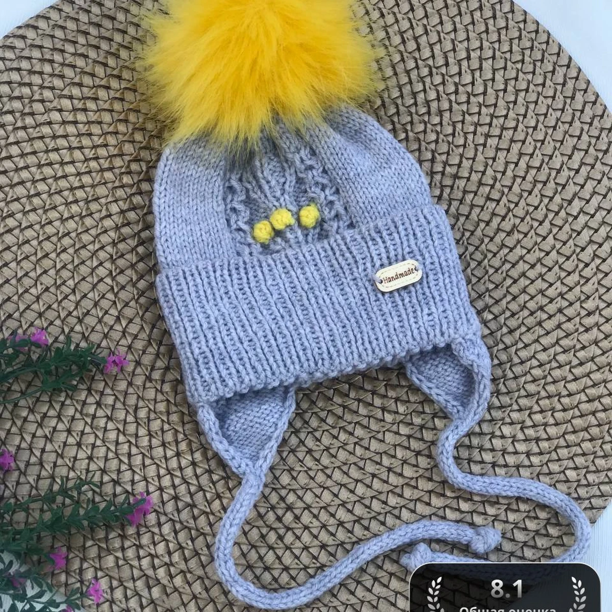 Шапочка связана из мягкой пряжи средней толщины лицевой гладью с добавлением отдельных рельефных узоров, которые придают текстуру и структурный интерес. Верх изделия украшен крупным помпоном, что добавляет динамичности внешнему виду. Использованы спицы среднего размера, которые позволяют достигать ровности и точности в вязании. Декоративные элементы выполнены в виде трёх шариков перед шапкой, которые делают её уникальной и придают дополнительный акцент. Уши шапочки связаны аккуратными жгутами и плавно переходят в завязки, что делает изделие не только красивым, но и функциональным, обеспечивая тепло и комфорт. Каждая петля усилена дополнительной нитью для увеличения долговечности и формы изделия. Комбинация основного серого цвета с ярким жёлтым акцентом на помпоне подчеркнута тщательной стыковкой цветных переходов, что свидетельствует о высоком уровне мастерства и внимании к деталям. Вся структура шапочки оформлена чёткими краями, что делает её подходящей для повседневного использования и особенных случаев.