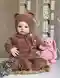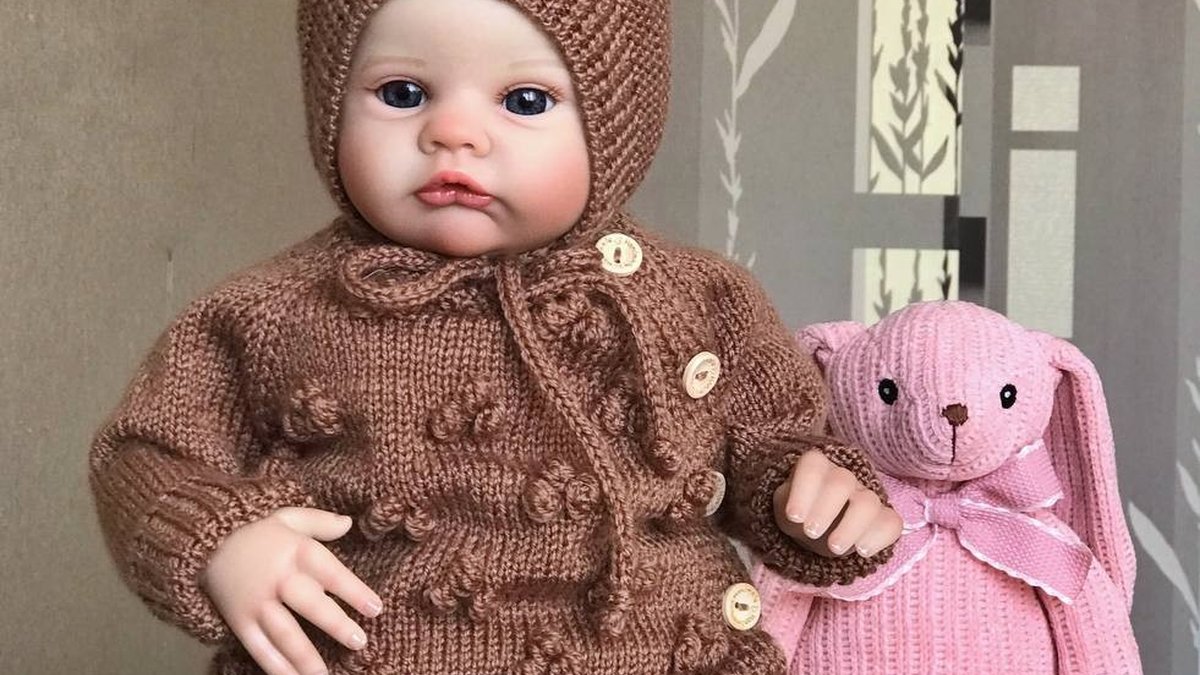 Тёплый «медвежий» комплект для малыша в шоколадном оттенке выглядит очень цельно и по‑магазинному: шапочка с ушками, кофточка на пуговицах, штанишки и пинетки связаны аккуратно и ровно. Фактурные «шишечки» на переде добавляют объёма и делают вещь наряднее, а резинки и планки держат форму. В кадре также милый розовый зайка-компаньон — удачное дополнение, подчёркивающее детскую тему и нежность подачи.