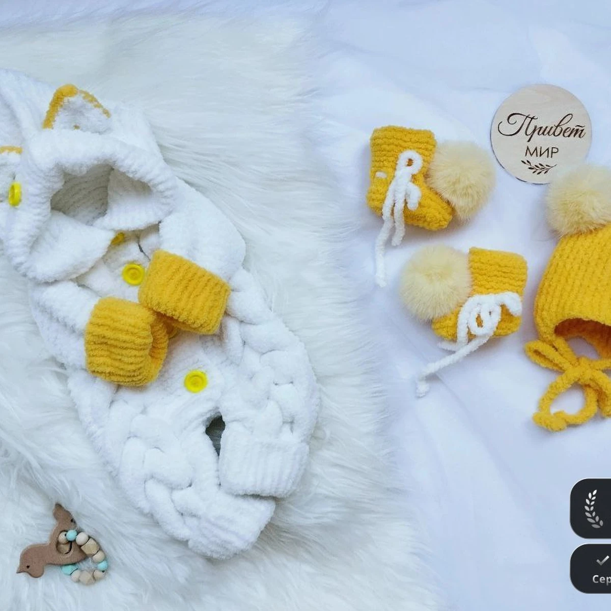 Этот очаровательный комплект для малышей включает в себя удобный комбинезон с капюшоном, варежки, шапочку с милыми помпонами и уютные пинетки. Золотистый цвет добавляет теплоту и живость белому фону, создавая веселый и стильный ансамбль для маленьких модников. Взбитая текстура изделия подчеркивает заботу и внимание к деталям, характерные для ручной работы.