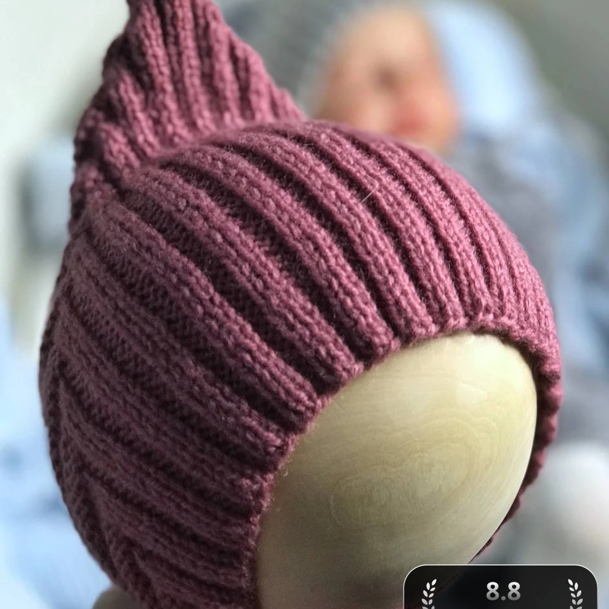 Очаровательный детский боннет-шапочка «эльфийский колпачок» связана упругой резинкой, образующей аккуратные вертикальные дорожки. Мягкая припылённо-розовая мериносовая пряжа подчёркивает фактурность и создаёт нежный, уютный образ. Уверенное закрытие макушки формирует выразительный остренький «хохолок», который смотрится очень мило на детской головке. Завязочки из той же пряжи обеспечивают хорошую посадку и добавляют практичности. На фоне размытых оттенков съёмки шапочка выходит на первый план, позволяя рассмотреть качество петель и ровность натяжения нити.