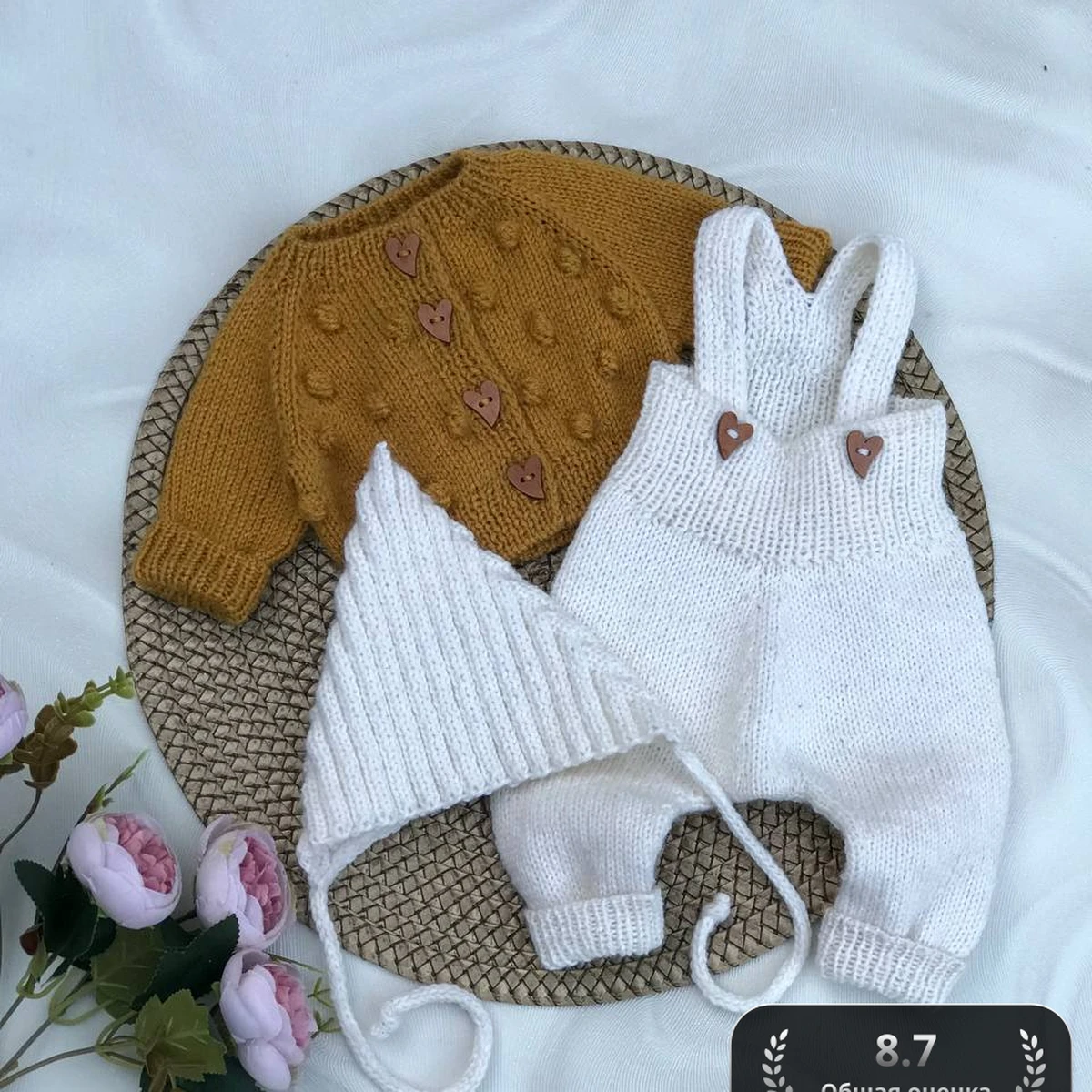 Очаровательный детский комплект из трёх вещей мгновенно покоряет сердце: карамельно-горчичный жакет с рельефными «шишечками» и милыми пуговицами-сердечками, нежный сливочный ромпер на лямках с аналогичными кожаными сердечками и треугольная шапочка-эльф из упругой английской резинки. Тёплая фактура полушерстяной пряжи, плавные линии реглана и ровное лицевое полотно создают ощущение уюта и заботы. Контраст тёплого горчичного и чистого белого подчёркивает современный сканди-шик, а аккуратные детали придают комплекту авторский шарм.