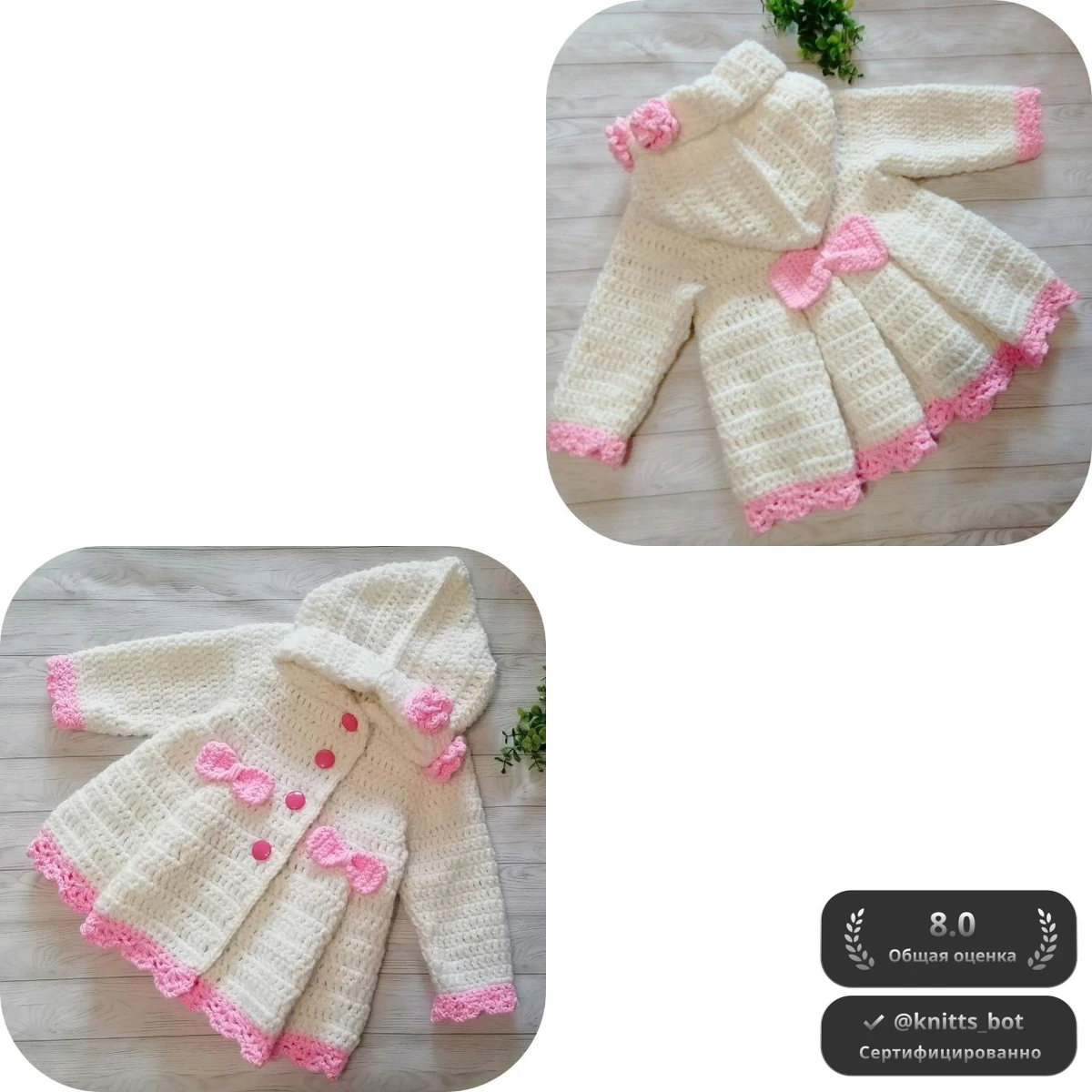 Очаровательное детское пальтишко-пончо связано крючком из молочно-кремовой пряжи и украшено нежно-розовыми акцентами. Объёмные рельефные столбики образуют тёплое полотнище, расклёшенная юбка даёт красивую драпировку и свободу движения. Капюшон с рифлёной кромкой гармонирует с кружевной отделкой по низу и манжетам, а розочки-цветы и аккуратные бантики придают образу сказочную женственность. Контрастные розовые пуговицы подчёркивают линию застёжки и делают пальто удобным для малыша. Изделие выглядит уютно и нарядно, подойдёт и для прогулок, и для фотосессии.