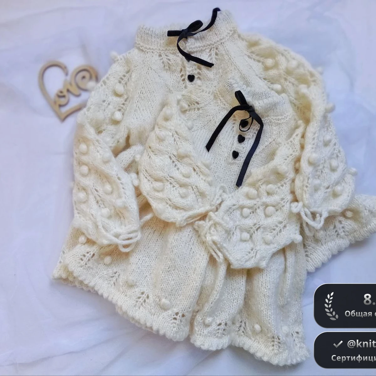 Нежнейший комплект для малышки в молочном оттенке: ажурная кофточка-болеро с регланом сверху, пышной юбочкой и рукавами, украшенными объёмными «шишечками». Лёгкие листочки в ажуре создают волнистый край, а чёрные атласные ленточки и крошечные пуговки-сердечки добавляют изысканного контраста. Полотно выглядит ровным, узор читается отлично, а мягкая пряжа придаёт изделию уют и воздушность. Работа требует внимания к деталям и демонстрирует хорошее владение техникой вязания сложных рукавов и декоративных элементов.
