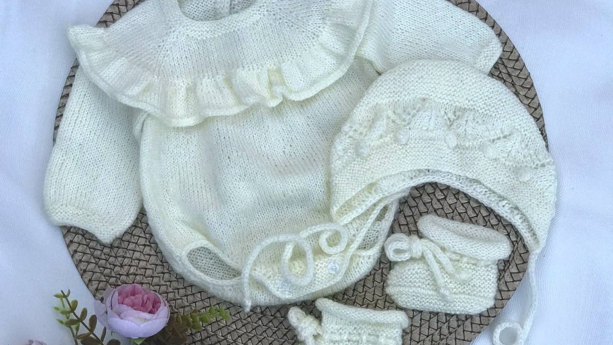 Комплект выполнен спицами тонкой пряжей, основное полотно связано лицевой гладью: она даёт ровную «шелковистую» поверхность, хорошо читаемую в светлом цвете. Верх боди оформлен круглой кокеткой с прибавками по линиям реглана/круговой кокетки (визуально прибавки распределены равномерно, без грубых «ступенек»), что обеспечивает мягкую посадку на плечиках малыша. Оборка формируется либо набором петель по краю кокетки, либо вывязыванием расширения за счёт прибавок в одном из рядов, после чего идёт несколько рядов лицевой глади/платочной вязки для стабильности края. Платочная вязка также использована в аксессуарах: она хорошо держит форму, не закручивается и подходит для пинеток. Чепчик связан с классическим построением: лицевая гладь по полотну и декоративная ажурная полоса (накид + убавки), затем оформлена кромка и выполнены завязки (шнурок i-cord/полый шнур либо скрученный шнур). Завершение — аккуратная сборка и ВТО: лёгкая блокировка расправляет ажур и стабилизирует оборку, делая силуэт более «магазинным».