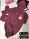 На фото — очаровательный детский вязаный комплект в оттенке «пыльная слива»: комбинезон/слип на планке с пуговицами, шапочка и пинетки (всё в одном стиле). Полотно выполнено лицевой гладью с аккуратными резинками по краям; на шапочке и пинетках — декоративные «шишечки», которые дают милую фактуру и делают набор наряднее. На комбинезоне — небольшая аппликация птички с фатиновой юбочкой: нежная деталь, добавляющая характера. В целом работа выглядит тёплой, цельной и очень подарочной.