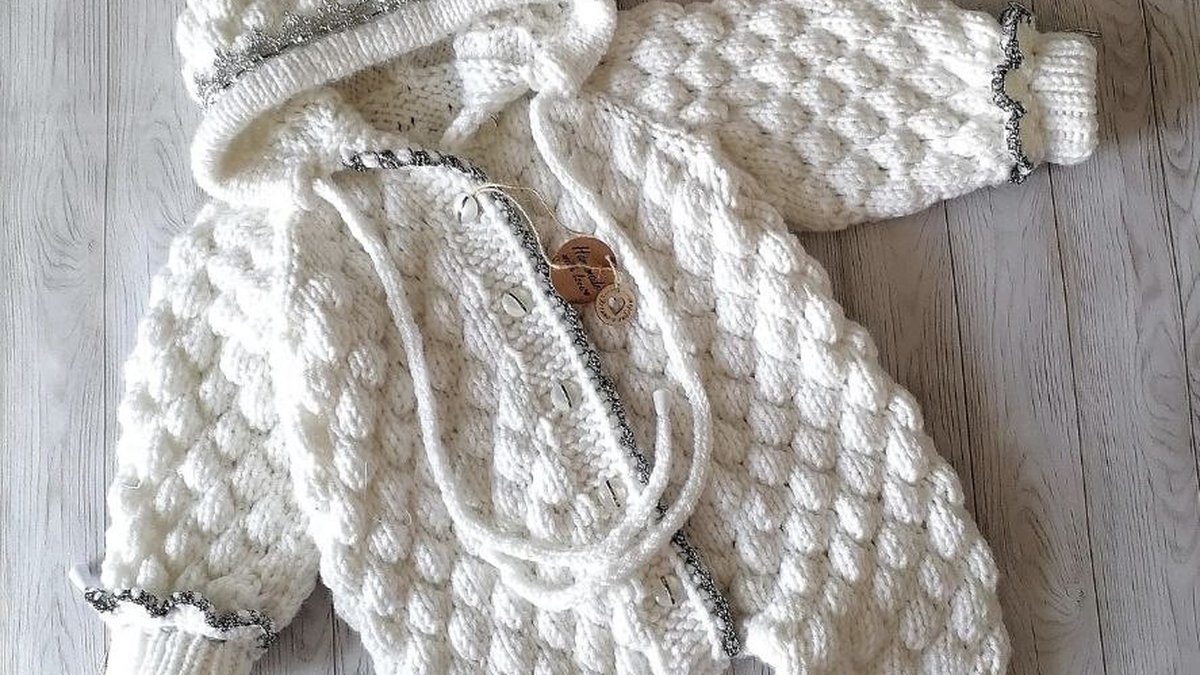 Нарядный зимний комплект для малыша в молочно‑белой гамме: объёмный комбинезон с капюшоном, шапочка с декором и пинетки. Фактурный узор «шишечки/попкорн» смотрится богато и даёт приятную толщину, манжеты выполнены плотной резинкой для посадки. Серебристая отделка и стразы добавляют «праздничности», а помпон делает образ завершённым. Работа в целом аккуратная и вполне «магазинного» уровня, с хорошей геометрией и продуманным набором вещей.