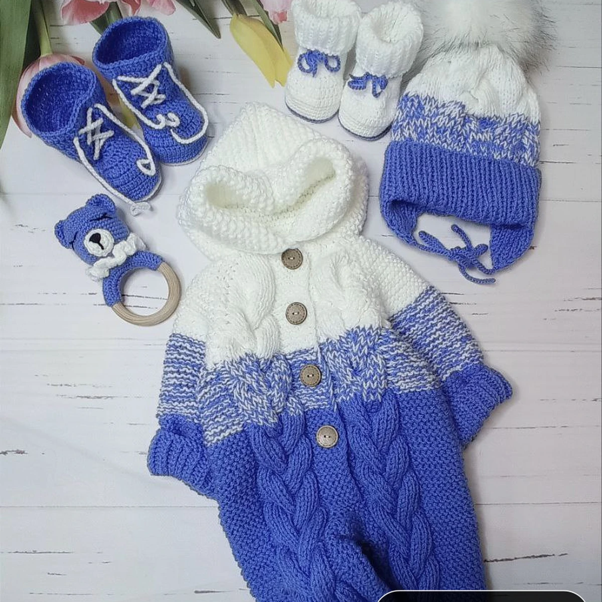 Комбинезон выполнялся снизу вверх двумя отдельными штанинами чулочной вязкой; после соединения по талии полотно переходило в жемчужную структуру, а затем в двойные объёмные косы по центру каждой штанины. Боковые швы закрывались матрасным швом, подчёркивая безупречность кромок. На уровне груди использована пряжа двух оттенков, провязываемая поочерёдно через каждые два ряда для создания нежного меланжевого эффекта. Капюшон набран по вырезу горловины и связан платочной вязкой с формированием скруглённой макушки с помощью укороченных рядов. Пуговицы пришиты через обвязанные петельные отверстия, сформированные способом «два вместе, накид». Шапочка вязалась по кругу на чулочных спицах 3,5 мм резинкой 1×1 для отворота, далее перешла в плотный лицевой жаккард из синей и белой нитей; убавки оформлены по шести клиньям «звездой». Завязки — полый айкорд, привязанный к нижнему краю. Пуховый помпон пришит потайными стежками. Пинетки-кроссовки выполнены крючком №2,5 столбиками без накида, с имитацией боковых швов при помощи «ракушек»; шнуровка — витой шнур из хлопка. Классические пинетки связаны спицами резинкой 2×2 и отворотом. Снуд — по спирали полупатентной резинкой, а погремушка — крючком вокруг деревянного кольца, голова мишки набита холлофайбером.