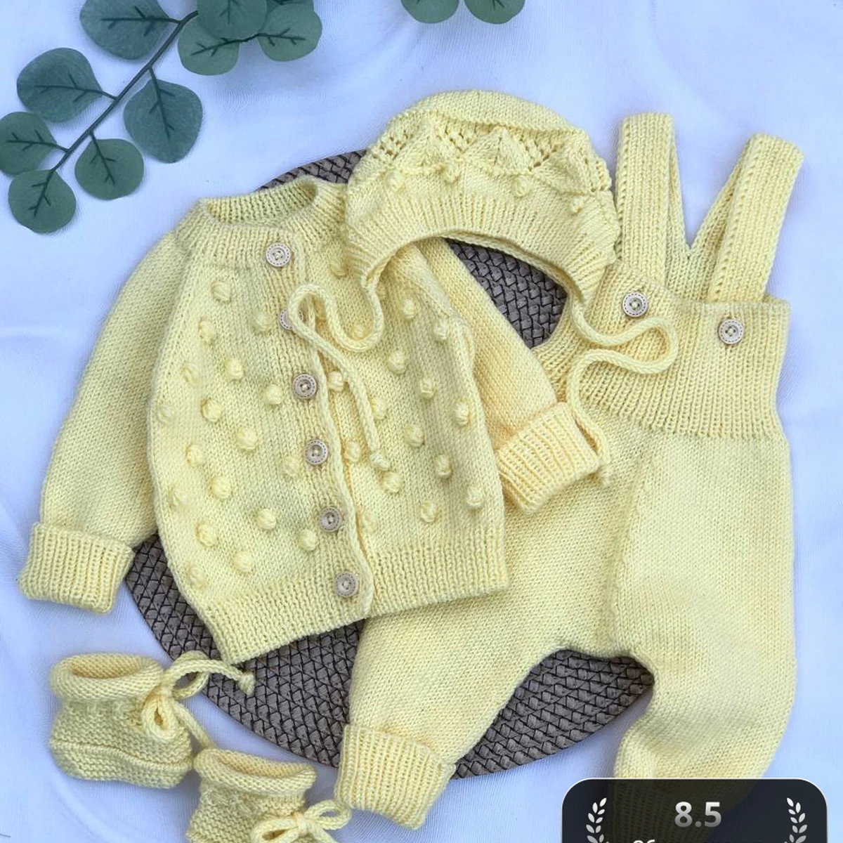 Нежный лимонный комплект для малыша включает жакет реглан с «пузырьками», комбинезон с планкой-резинкой и пуговками на лямках, ажурную шапочку с теми же «пупырчатыми» элементами и пару очаровательных пинеток на завязках. Чистое, ровное лицевое полотно подчёркивается фактурой шишечек, а аккуратные резинки удерживают форму. Единый пастельный тон создаёт воздушный, солнечный образ, идеально подходящий для первых фотосессий и уютных прогулок. Видно, что автор старательно контролировал плотность и следил за симметрией деталей – швы малозаметны, пуговицы подобраны в тон. Фото хорошо освещено, текстура пряжи читается, а композиция позволяет рассмотреть каждую вещь.