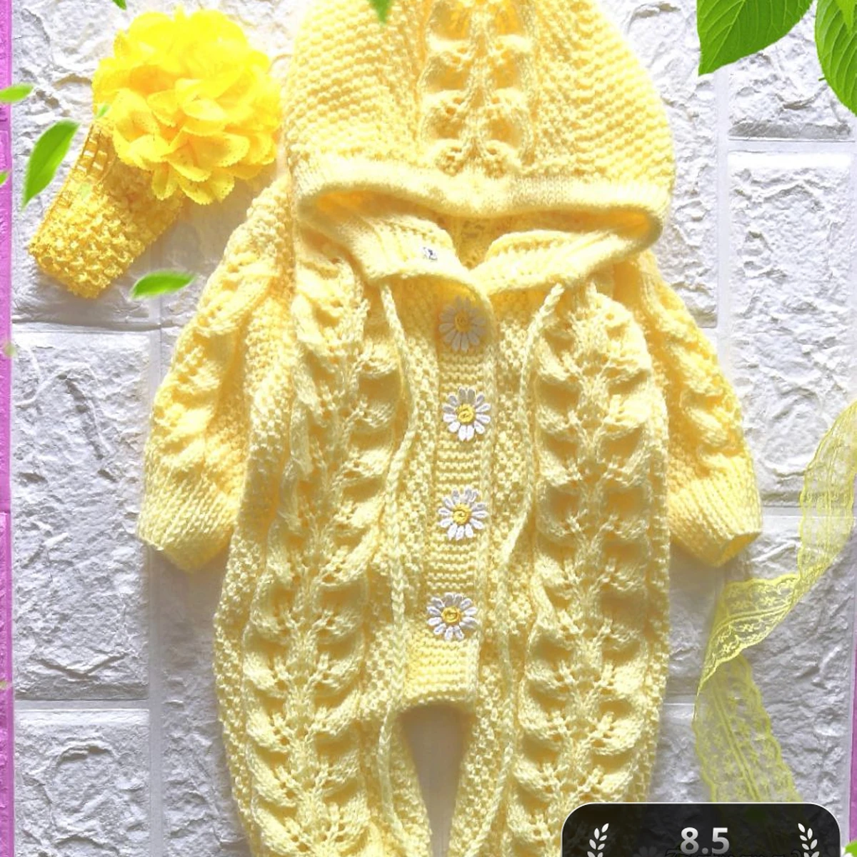 Этот милый вязаный комплект для малыша включает в себя очаровательный желтый комбинезон с капюшоном и повязку на голову. Комбинезон украшен узорами в виде листиков и милыми цветочными пуговицами, создавая солнечное и радостное настроение. Повязка на голову добавляет комплекту дополнительные очаровательные акценты.