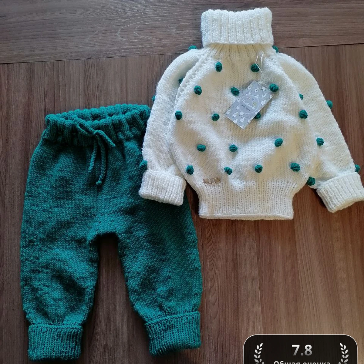Очаровательный детский комплект из уютных штанишек цвета хвойного леса и молочного свитерочка-«попкорна» с фактурными изумрудными шишечками. Высокий ворот-подворот и манжеты 2×2 надёжно защитят от ветра, а мягкая резинка на талии брюк комфортно фиксируется шнурочком. Бобблы, расходящиеся по реглану и телу свитера диагональными дорожками, придают игривость и подчёркивают пушистую пряжу с лёгким блеском. Контраст глубокого зелёного и сливочного оттенков смотрится свежо и стильно, а аккуратная гладь подчёркивает ровность петель. Идеальный наряд для прогулок поздней осенью и весной!