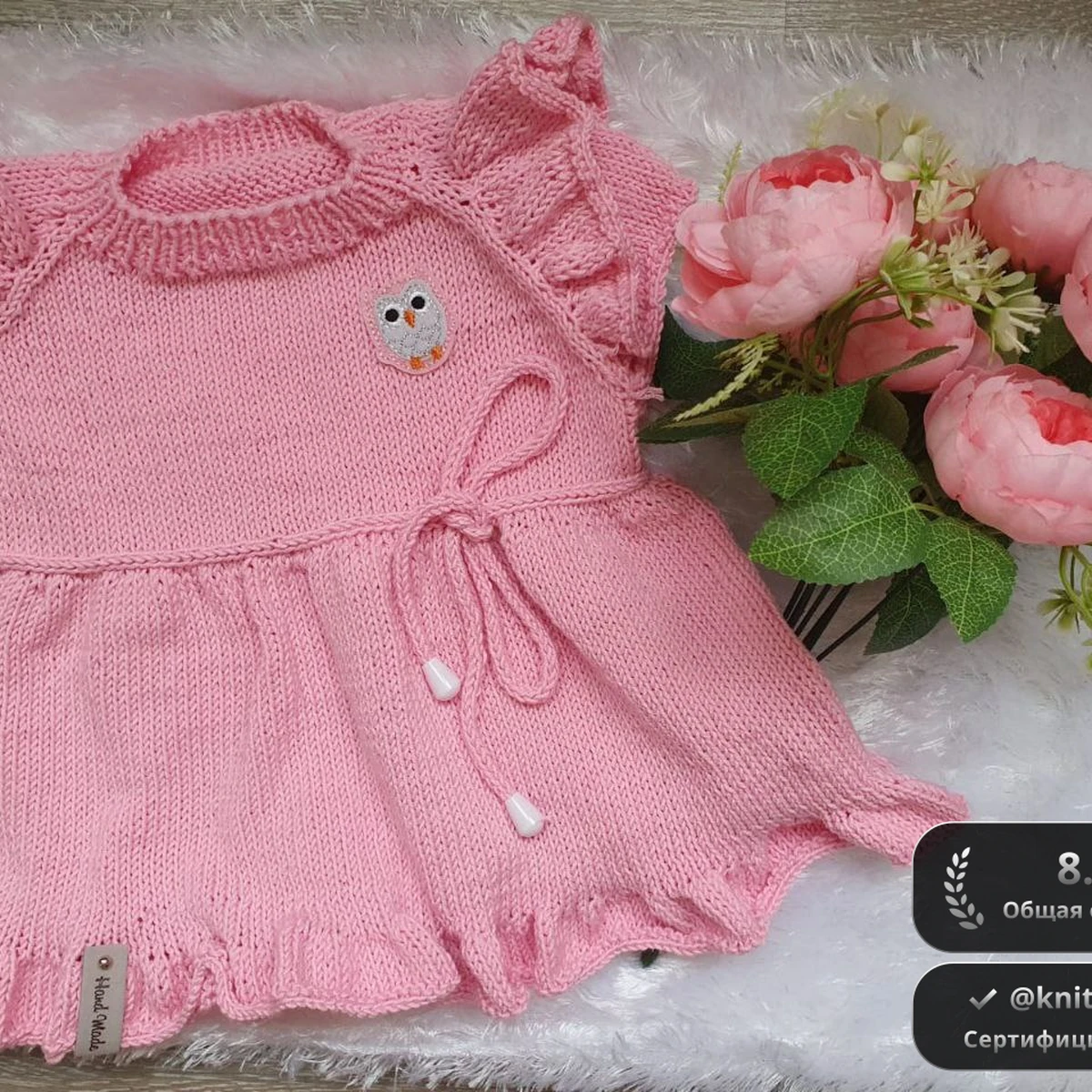На фото изображено милое розовое вязаное платье для малыша, украшенное симпатичной аппликацией в виде совы. Платье выполнено из мягкой пряжи, что делает его очень комфортным для детской кожи. Маленькие рюши на рукавах и подоле добавляют изделию дополнительное очарование. На платье есть поясок, который добавляет элегантности.