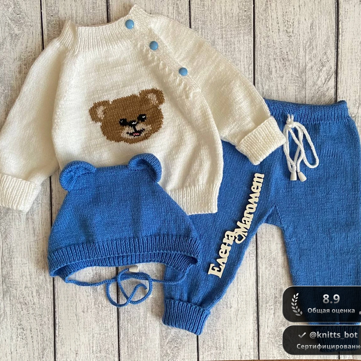 Очаровательный детский комплект из трёх вещей—мягкий молочно-белый свитер с медвежьей мордочкой, яркие васильковые штанишки на регулируемом шнурке и шапочка с забавными ушками-полуколечками. Аккуратная лицевая гладь, ровные убавки по реглану, аккуратная ластовица в штанишках и плотно связаная резинка 1×1 создают безупречную посадку и комфорт. Интарсия медвежонка проработана до мелочей: живой взгляд, объёмный носик и чёткие контуры без протяжек. Вся палитра—лаконичное сочетание сливочного и небесно-синего с тёплым коричневым акцентом—выглядит свежо и по-детски уютно, а три застёжки-кнопки на плече облегчают переодевание малыша.