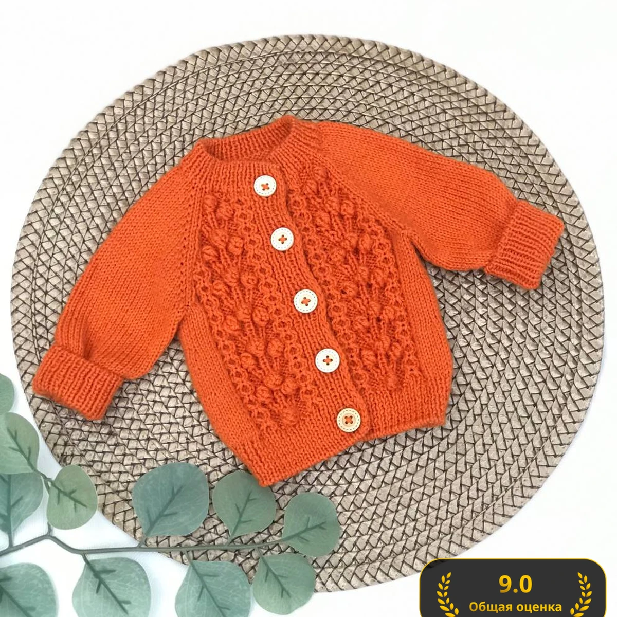 Очаровательная детская кофточка выполнена лицевой гладью с роскошными ажурно-шишечными вставками по полочкам. Яркая тыквенно-оранжевая пряжа сразу поднимает настроение, а крупные деревянные пуговки с цветочками добавляют уютный, рустикальный шарм. Рукава-фонарики с плотными манжетами подчёркивают детскую нежность, воротник-резинка аккуратно обрамляет горловину. Изделие выглядит аккуратным, равномерным и хорошо отпаренным – каждая петелька ложится ровно, а шишечки вспушены и объёмны.