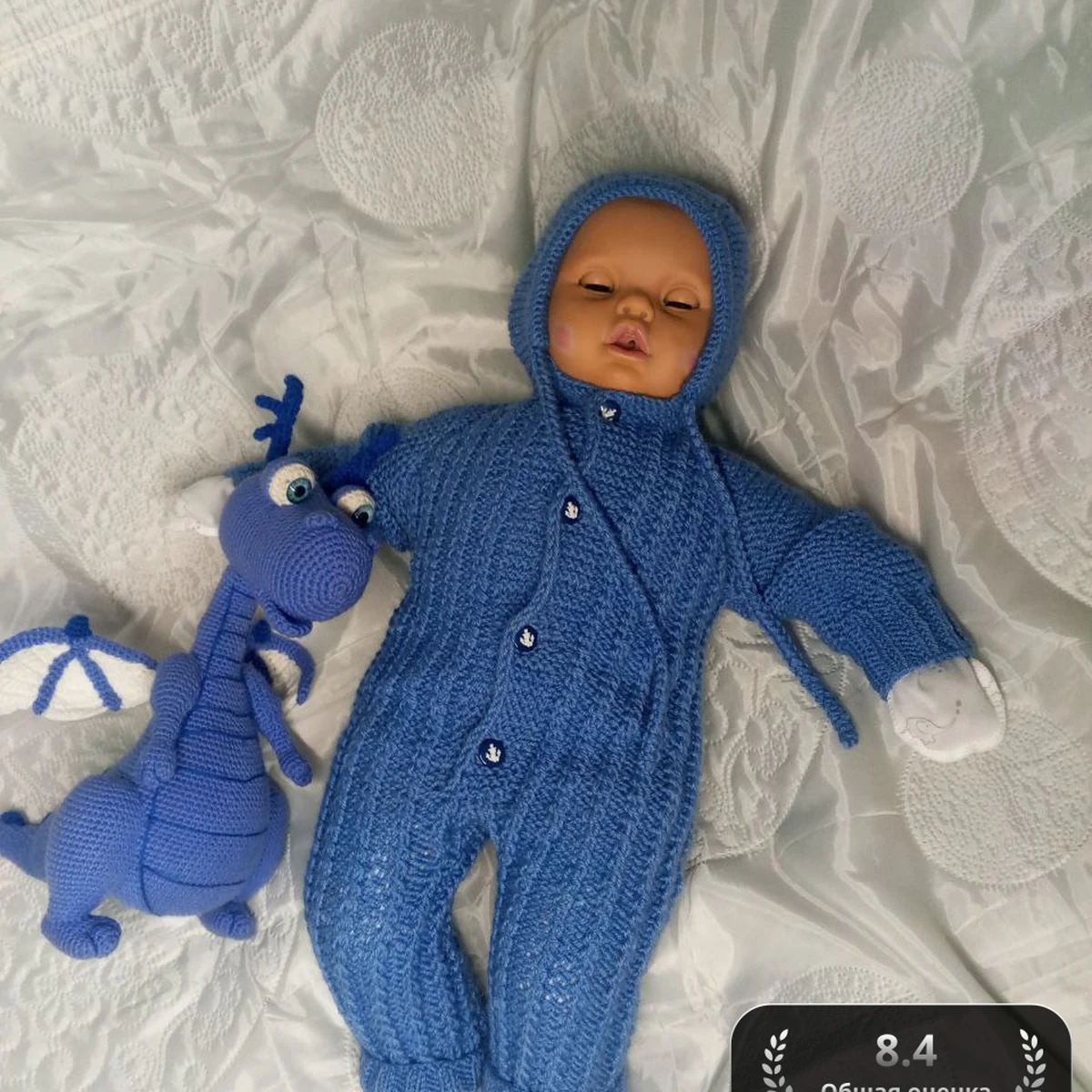На фото – очаровательный детский комбинезон с капюшоном насыщенного василькового оттенка и дружелюбный амигуруми-дракон в той же цветовой гамме. Комбинезон связан рельефными продольными дорожками, создающими приятную фактурность и дополнительную эластичность ткани. Манжеты, капюшон и планка оформлены аккуратной резинкой, а ряд пуговок-лапок придаёт игривый акцент и облегчает переодевание малыша. У дракончика объёмные крылья, хвостик и забавные рожки – отлично продуманная деталировка, подчёркивающая характер игрушки и идеально сочетающаяся с основным изделием.