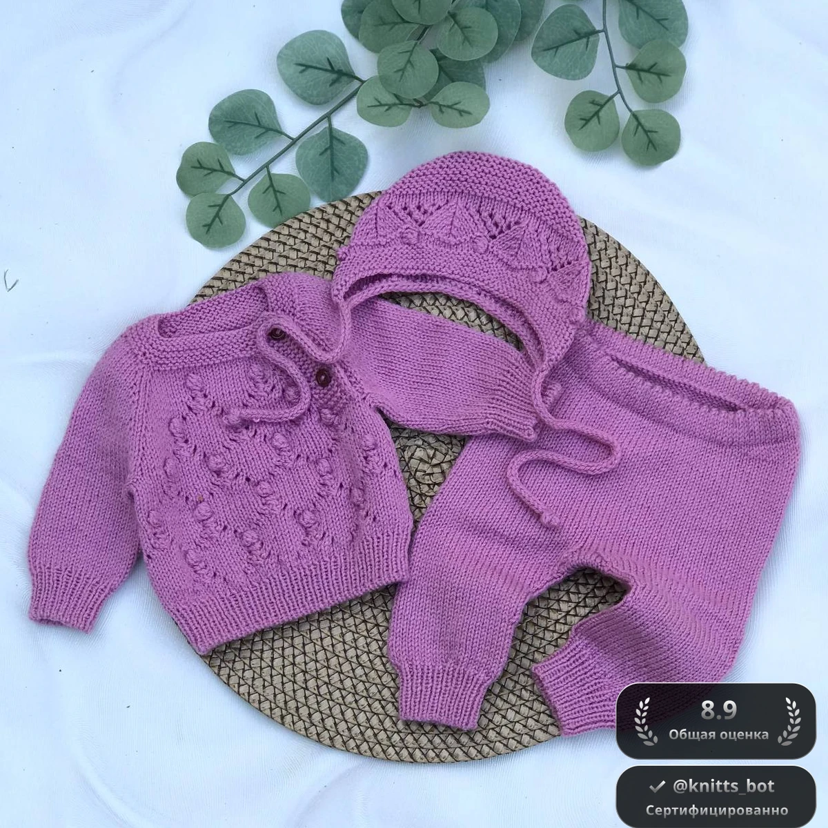 Милейший трёхпредметный комплект для малыша: реглан-свитер с ажурными «шишечками», шапочка-капор с листочками по краю и ползунки на кулиске. Ровная лицевая гладь и фактурные элементы образуют нежную, но выразительную игру текстур, а единый пудрово-сиреневый оттенок придаёт ансамблю цельность. Капор украшён аккуратной ай-корд завязкой, манжеты и низы связаны эластичной резинкой 1×1, что удобно для активного ребёнка. Фото чёткое, предметы разложены на контрастной циновке и фоне, декор из эвкалипта добавляет лёгкой эко-нотки.