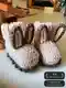 На фотографии представлена пара очаровательных детских пинеток, выполненных в форме зайчиков. Эти пинетки сразу привлекают внимание своими милыми ушками, которые добавляют им игривый и забавный вид. Цветовая гамма, состоящая из бежевых и коричневых тонов, делает их уютными и стильными. Это идеальный подарок для малыша, который подарит радость и комфорт.