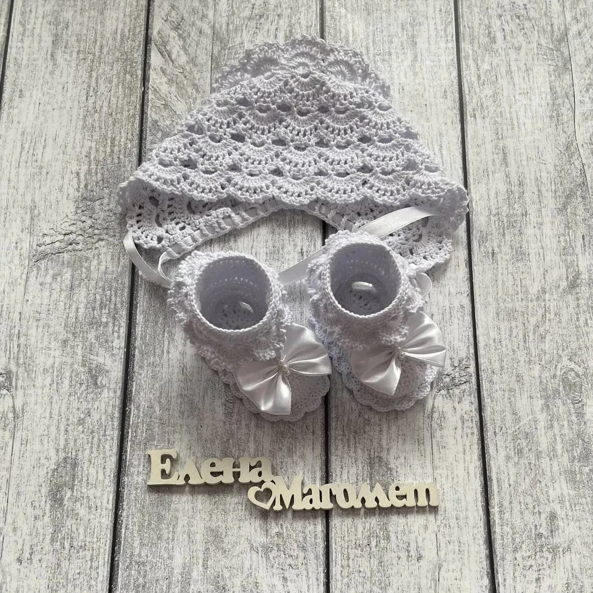 Нарядный белоснежный комплект для малыша — ажурный чепчик с волнистой каймой и пинетки с аккуратными оборками и атласными бантиками. Узор «ракушки» ложится ровно и даёт красивую фактуру, а отделка лентой добавляет праздничности без перегруза. Формы читаются: у чепчика хорошая посадка по затылку и плавное расширение, у пинеток — выразительный подъём и симпатичный контур мыска. Комплект выглядит нежно и фотогенично, особенно для выписки или фотосессии.