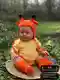 Этот очаровательный комплект включает в себя яркую оранжевую шапочку в виде жирафика и соответствующие пинетки. Детали, такие как ушки и рожки на шапочке, добавляют милый акцент, усиливающий общее впечатление. Пинетки выполнены с красивым ажурным узором, что придаёт комплекту особую изюминку. Кукла, одетая в этот наряд, сидит в окружении весёлых цветов на фоне природы.