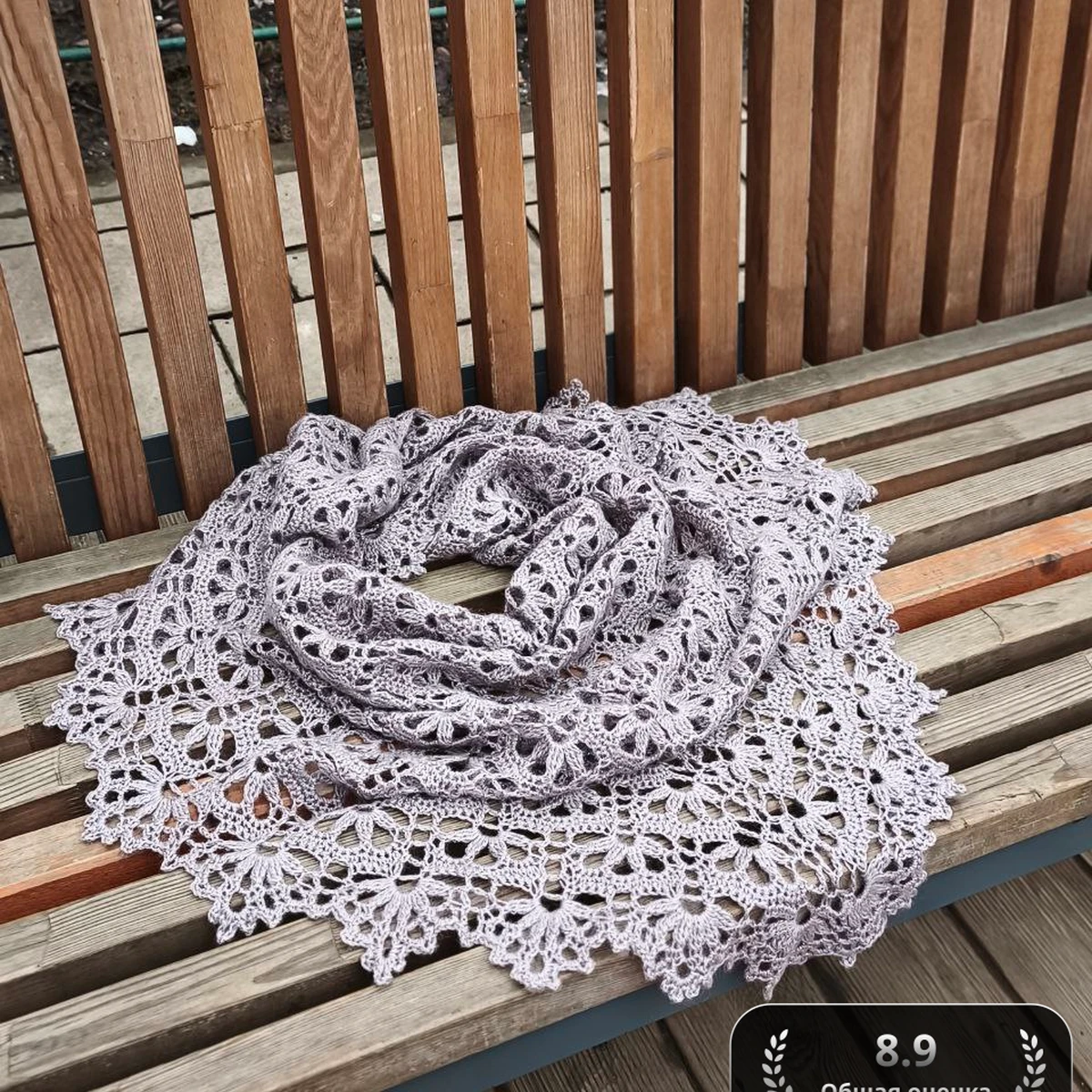 Перед вами изысканный вязаный шарф или шаль, выполненный в технике крючком. Он украшен ажурными узорами, которые создают ощущение легкости и воздушности. Широкий ажурный край придает изделию особую элегантность, и его можно носить как аксессуар для шеи или плеч. Мягкий серый цвет делает изделие универсальным, подходящим для многих стилей одежды.