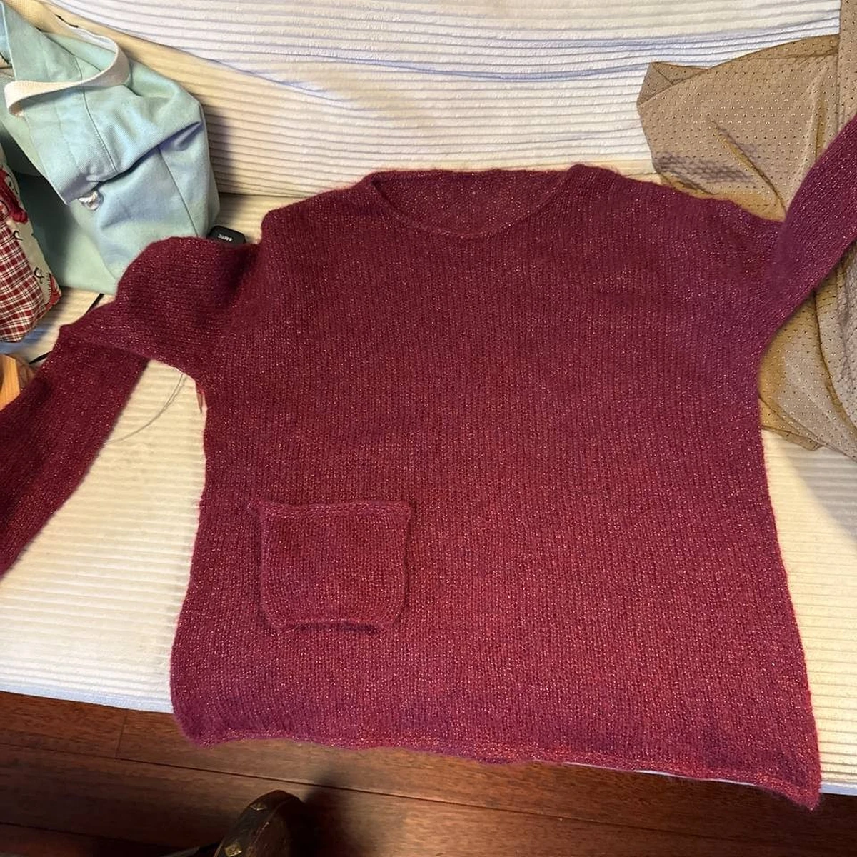 Уютный бордовый джемпер с мягким мерцанием пряжи выглядит тёплым и «носибельным» — именно та вещь, которую хочется надеть в прохладный день. Полотно выполнено ровно, силуэт читается уверенно, аккуратно оформлена горловина. Накладной карман добавляет характер и лёгкую расслабленность, но одновременно требует особенно точной посадки по месту. В целом работа крепкая и практичная: база, которую легко стилизовать и улучшать деталями.