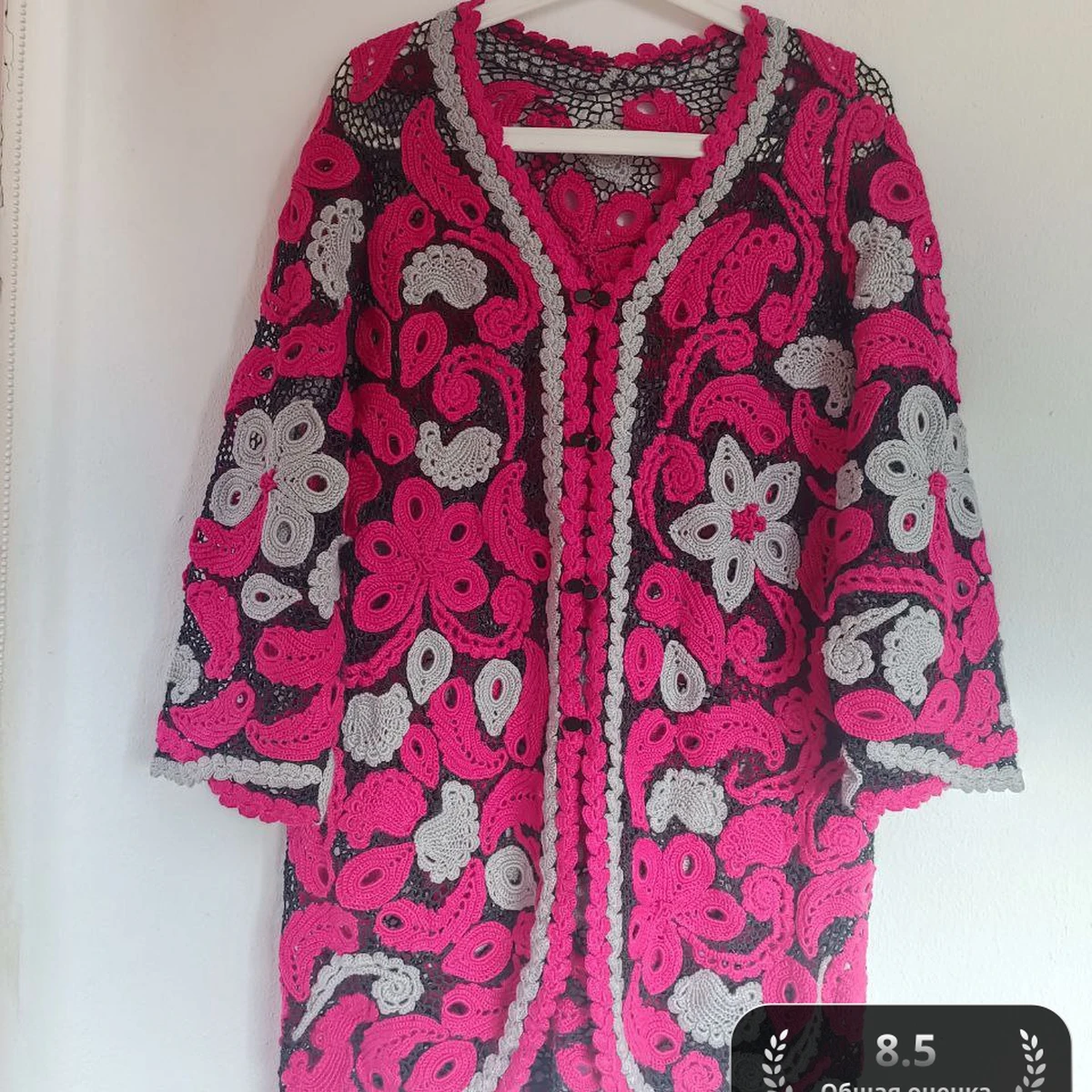 Это великолепное кроше-пальто привлекает внимание своим ярким цветочным узором. Выполненное в насыщенных оттенках малинового, серого и черного, изделие отличается сложной техникой ирландского кружева. Каждое мотивное цветочное воспроизведение выполнено с высокой точностью и тщательностью, демонстрируя уровень мастерства и креативности.