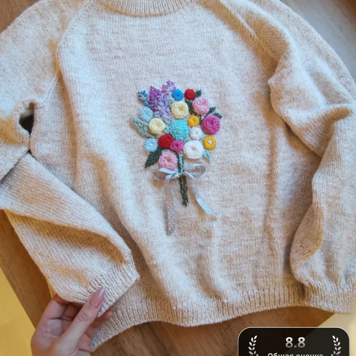 На фото вы видите стильный и нежный свитер, выполненный в спокойном светло-бежевом цвете. Особенностью изделия является чудесная вышивка в виде букета цветов на передней стороне, которая добавляет изделию уникальности и яркости. Это сочетание вязания и вышивки создает впечатление тепла и уюта, идеально подходящее для обновления повседневного гардероба.