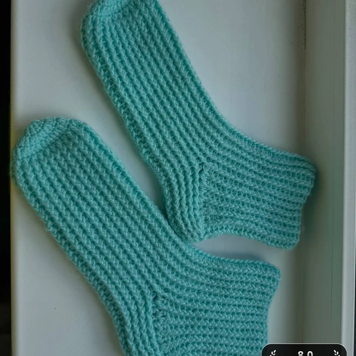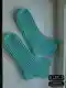 На фотографии изображены связанные носки мятного цвета. Они выглядят уютно и аккуратно выполнены. Простой, но привлекательный дизайн делает их идеальным выбором для холодных дней. Задумка с использованием одного цвета достаточно традиционна, однако это придаёт носкам универсальность.