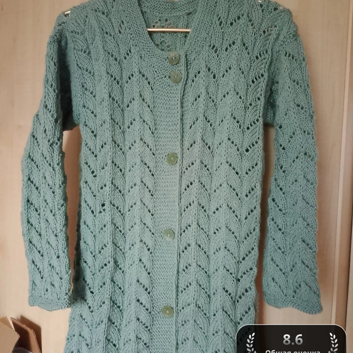 Уютный удлинённый кардиган нежно-салатового оттенка связан из пряжи среднего метража ажурным V-образным узором «ёлочка». Чёткие дорожки накидов и убавок создают изящные листики, которые придают полотну лёгкость, а плотная планка платочной вязкой с крупными пуговицами добавляет структурную строгость. Ровные, практически безупречные кромки, аккуратный вырез горловины и цельновязанные рукава подчёркивают высокий уровень мастерства. Кардиган смотрится воздушным, но при этом тёплым – идеальный спутник прохладной весны или ранней осени.
