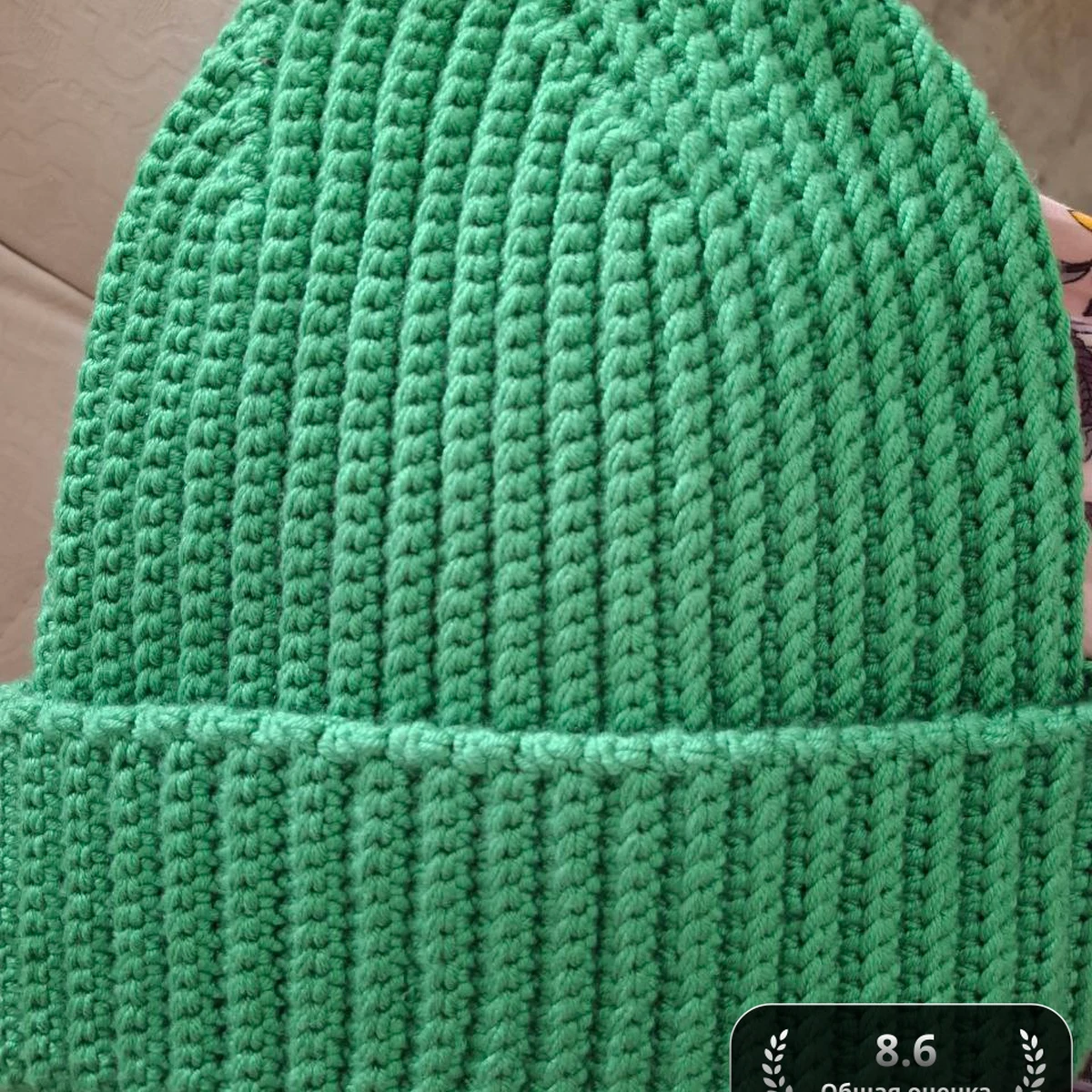 Уютная зелёная шапка-бинни выполнена плотной рубчиковой фактурой: вертикальные дорожки выглядят ровно и аккуратно, а одинаковая плотность петель создаёт гладкий, «тушки» силуэт. Сглаженные убавки на макушке собирают полотно в аккуратную звёздочку, а широкий отворот добавляет объёма и тепла. Яркий однотонный цвет напоминает сочную весеннюю мяту — он освежает и отлично подчёркивает текстуру. Фото достаточно чёткое: хорошо видны петли и структура, что позволяет оценить мастерство автора.