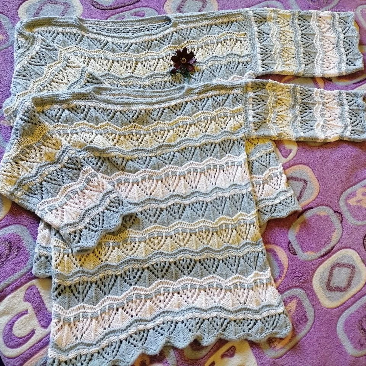 Нежный ажурный джемпер в спокойной природной гамме — серо-голубой, молочный и беж — выглядит лёгким и «воздушным». Ритм полос подчёркнут волнистой структурой и ажурными дорожками, из-за чего полотно играет фактурой даже без аксессуаров. Идея удачная и носибельная, узор достаточно трудоёмкий. По качеству видно уверенную работу, но изделию не хватает финальной «полировки»: лёгкая неразглаженность и отсутствие явной ВТО/блокировки съедают часть аккуратности, а фон фото отвлекает от красоты узора.