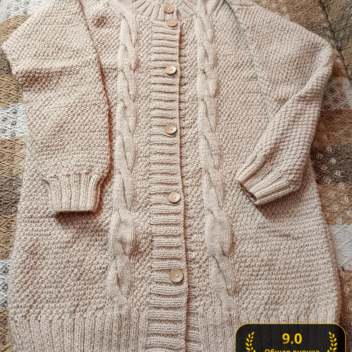 Объёмный кардиган до середины бедра связан из тёплой пудрово-бежевой пряжи. Центральный акцент – две крупные косы «колос» по планке, подчёркнутые фактурой мозаичного (рисового) полотна на полочках и рукавах. Широкая резинка 2х2 по низу изделия и манжетам придаёт форму и не даёт полотну растягиваться. Плотный воротник-стойка, плавно переходящий в планку с аккуратными деревянными пуговицами, завершает уютный образ. Кардиган выглядит добротно и гармонично благодаря единообразной текстуре, ровным петлям и естественной мягкой палитре.