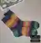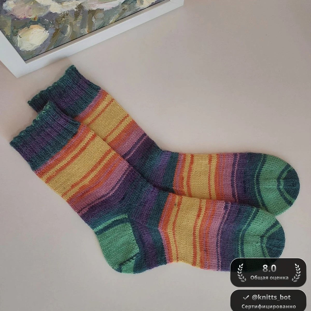 Эти носки связаны на круговых спицах, что позволяет избежать швов и обеспечивает отличный результат. Использование техники «по спирали» особенно удачно для создания таких гармоничных полос. При вязании использована техника 'подгиб резинки', что позволяет краю оставаться эластичным и не растягиваться с течением времени. В центре внимания находится смена цветовой палитры, которая достигается благодаря регулярным переходам цветов после нескольких рядов. Этот метод помогает добиться непрерывного и плавного перехода от одного цвета к другому, создавая эффект мультицветной мозаики. Носки выполнены с классической пяточной частью с углублением. Это встречается в традиционном способе вязания носков, который создаёт более прочную и износостойкую структуру. Обратите внимание на плавные убавления в области пальцев, обеспечивающие аккуратный и комфортный носок.
