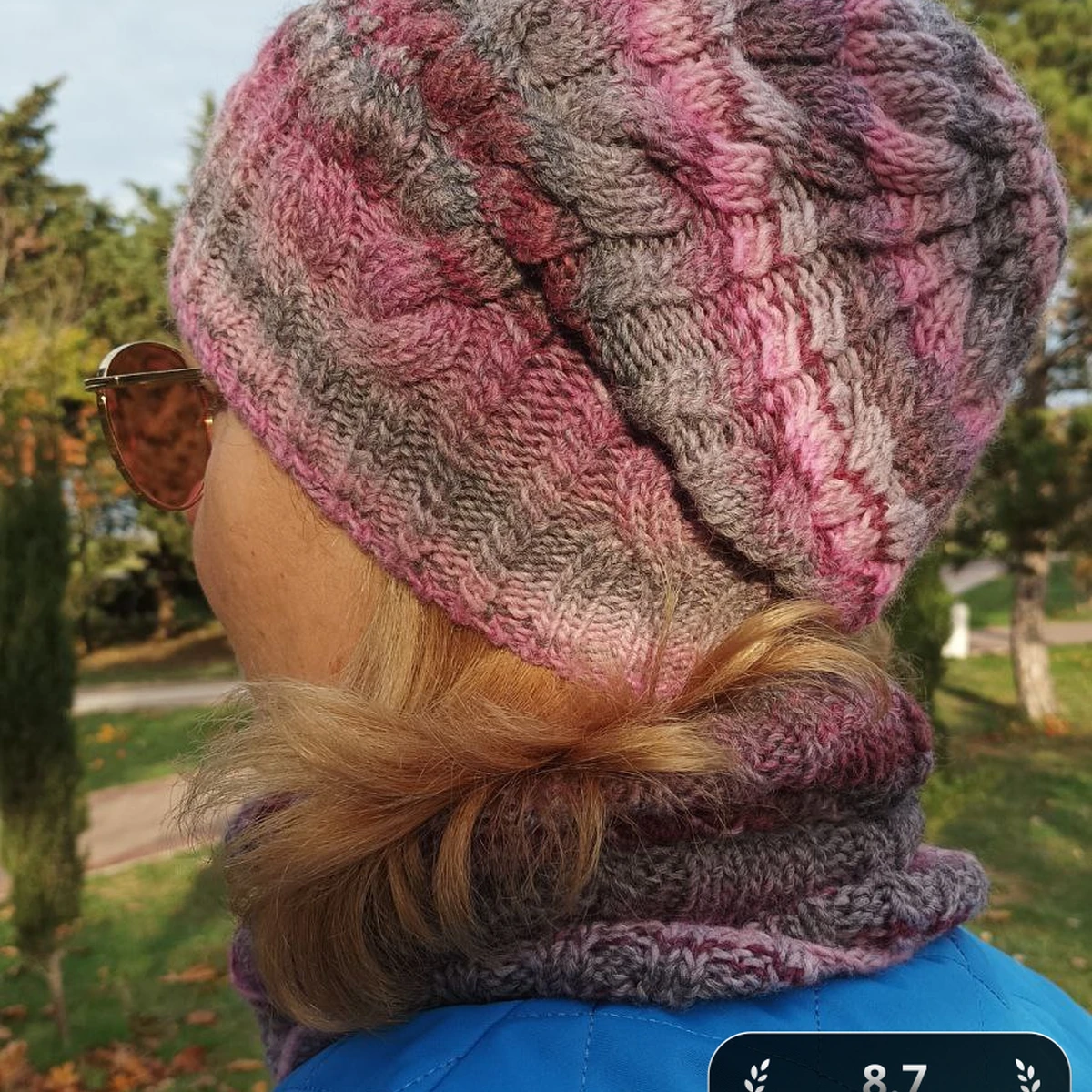 В основе шапки и снуда лежит классическое круговое вязание на чулочных или укороченных круговых спицах диаметром 4–4,5 мм, выполняемое снизу вверх. Набор выполнен эластичным методом немецкого скрестного набора, что обеспечивает гибкость и чистый край. После пары подготовительных рядов резинки 1×1 полотно переходит в рельефный узор из широких арановых жгутов: каждые восемь рядов выполняется перекрещивание восьми петель — четыре петли снимаются на вспомогательную спицу за работой, следующие четыре провязываются лицевыми, затем петли со вспомогательной спицы возвращаются и провязываются. Для плавного перехода цвета использована секционная пряжа, поэтому диапазон оттенков распределяется неравномерно, подчеркивая глубину аранов. Шапка формируется убавками по принципу «клины»: в каждом клине на вершине жгута выполняются симметричные протяжки, которые аккуратно сходятся в макушечную розетку. Снуд вяжется по кругу без швов, повторяя тот же раппорт узора. Закрытие петель выполнено эластичным методом Джени, чтобы край оставался растяжимым и не стягивал горловину. Финишная обработка включает лёгкую влажно-тепловую блокировку: изделия увлажняются из пульверизатора и раскладываются на ровной поверхности с незначительным растягиванием по ширине, что окончательно раскрывает рельеф жгутов и выравнивает плотность меланжевой нити.