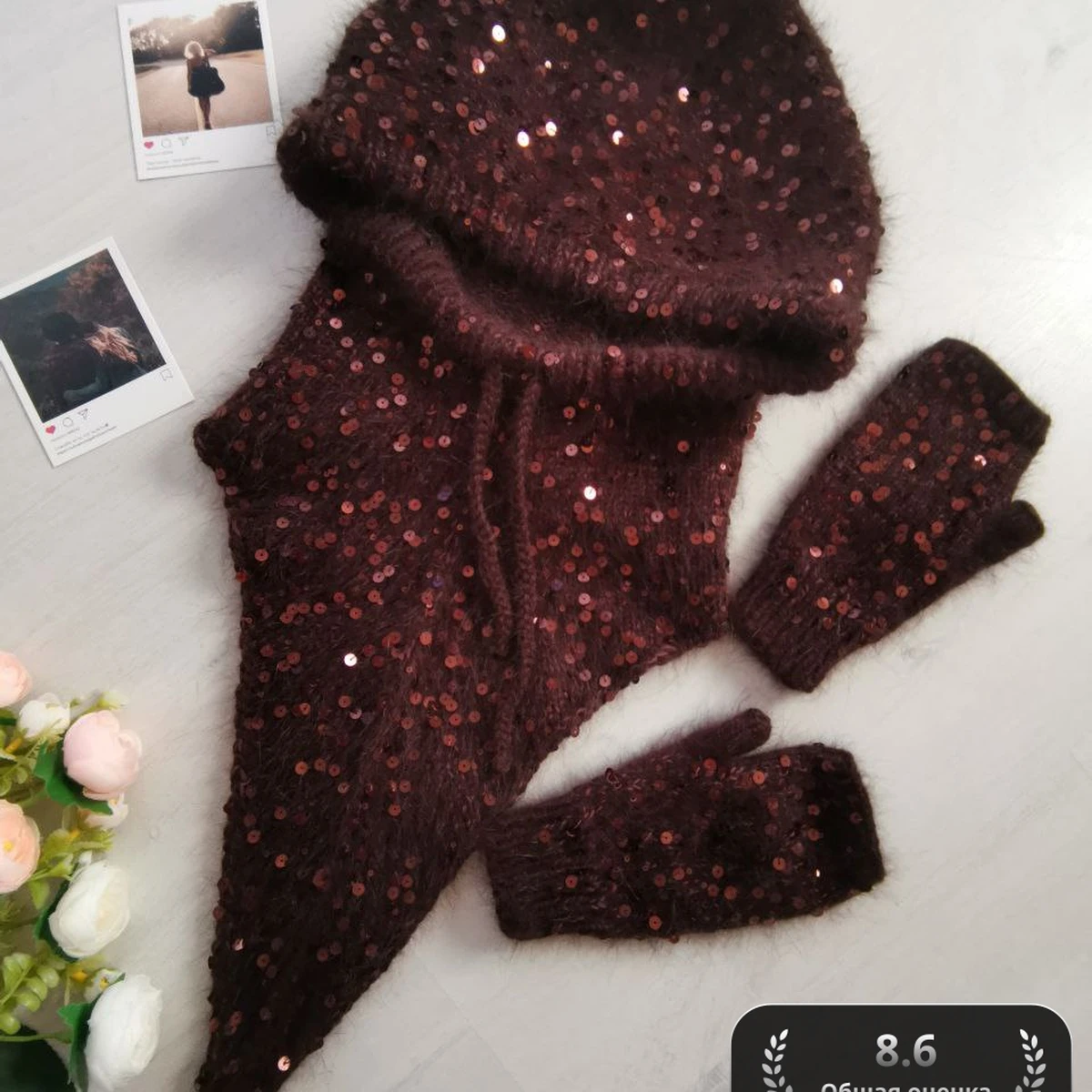 Комплект из пушистого мохера с пришитой лентой пайеток выглядит словно звёздная пыль на бархатном ночном небе. Объёмная удобная балаклава-капюшон плавно переходит в треугольный перед, защищая шею и грудь от ветра, а удлинённая макушка создаёт трендовый силуэт. К нему в тон связаны митенки-гетры: эластичная резинка на запястье, открытые пальцы для свободы движений и блеск пайеток, перекликающийся с головным убором. Глубокий шоколадно-бордовый оттенок подчёркивает богатую текстуру, а мягкий ореол мохера добавляет нежности и тепла.