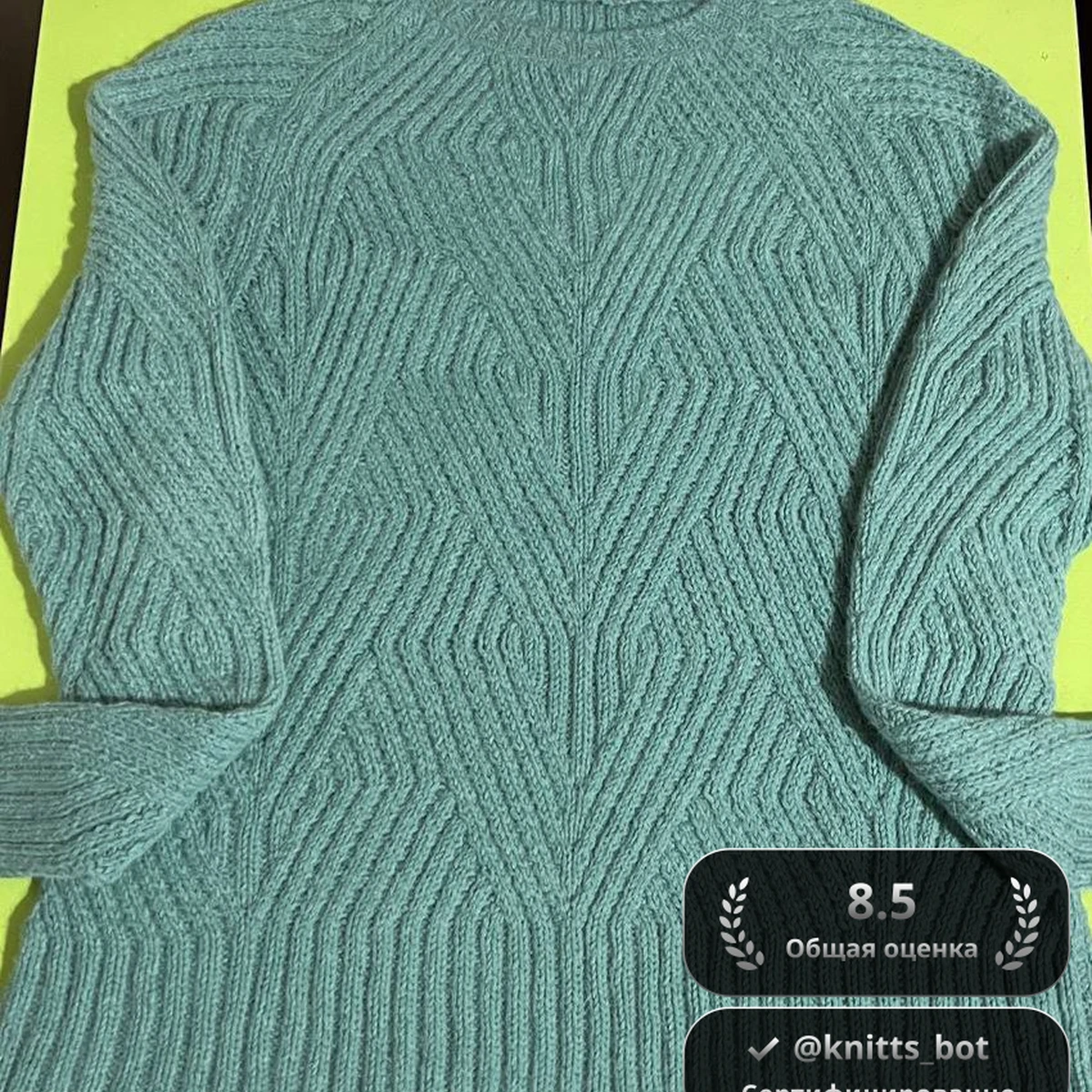 Этот свитер выполнен из мягкой пряжи и отличается сложным узором в виде направленных стрелок. Вязание имеет отличную плотность и структуру, что придаёт изделию изысканный вид. Цвет легкий, успокаивающий, идеально подходящий для холодного времени года.